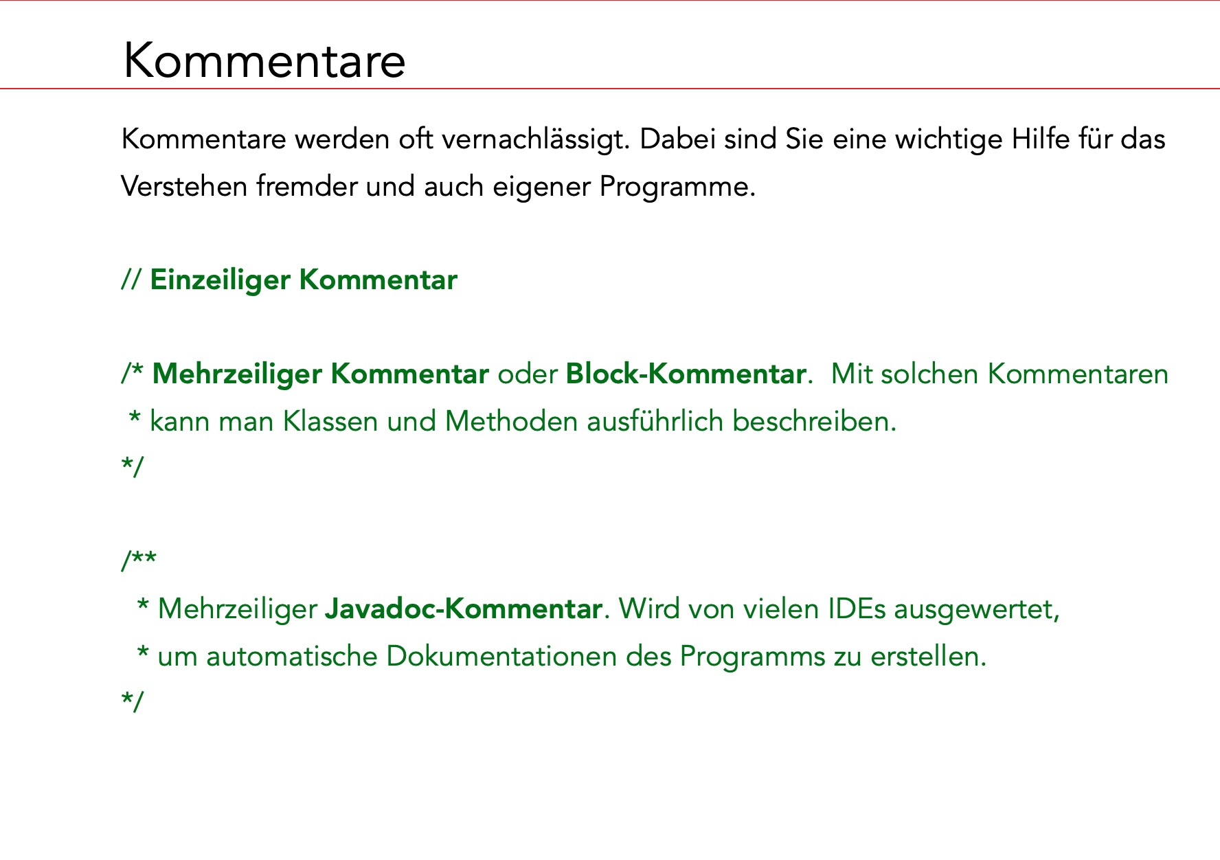 Natürlich kann man auch mit mehreren einzeiligen Kommentaren einen mehrzeiligen Kommentar erzeugen, aber neben dieser "Hau-drauf"-Methode gibt es "echte" mehrzeilige Kommentare. Diese beginnen mit den beiden Zeichen /* und enden mit */.