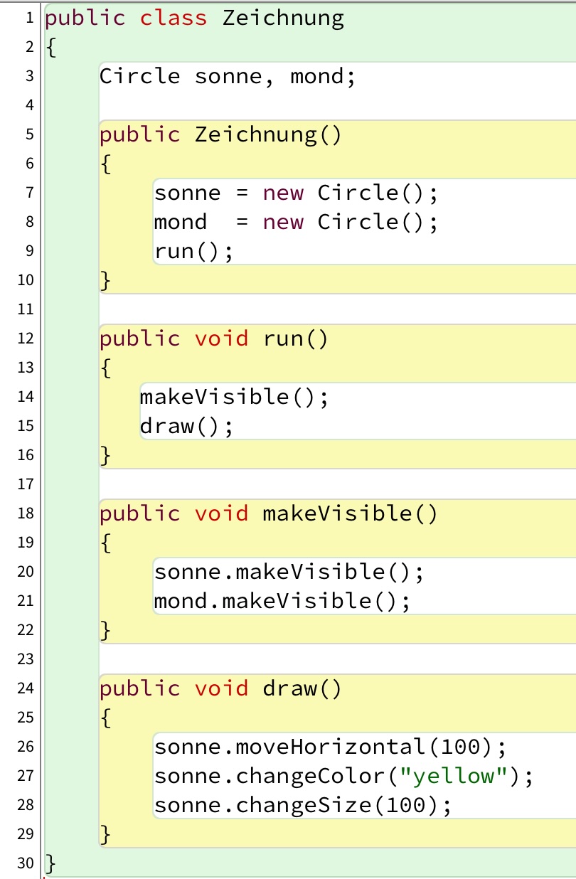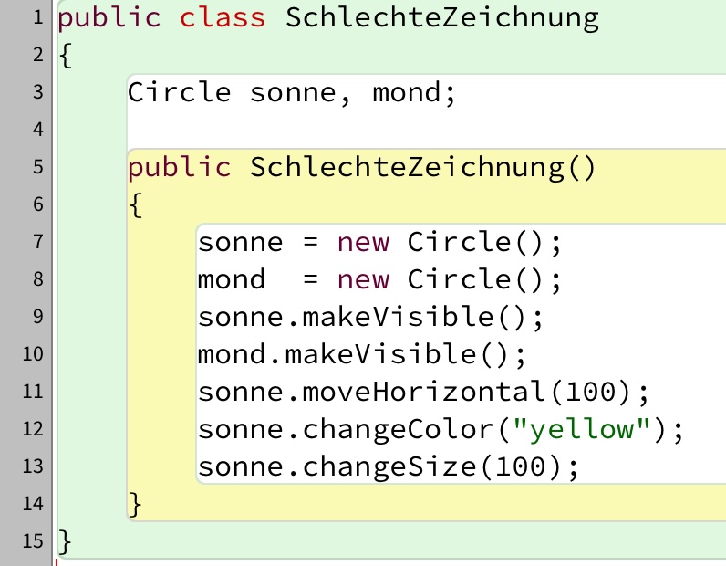 Der Konstruktor aus diesem schlechten Beispiel initialisiert die beiden Instanzvariablen, dann macht er die beiden Objekte sonne und mond sichtbar, und schließlich bewegt er das Objekt sonne, färbt es gelb und macht es größer. Das sind drei verschiedene Aufgaben, die dem Konstruktor hier zugemutet werden.