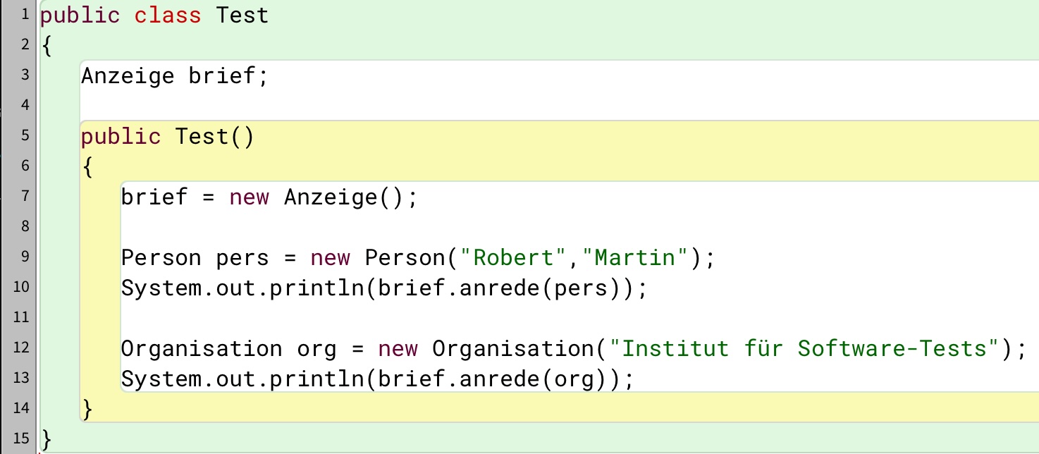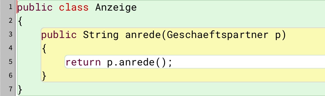 In einer weiteren Klasse Anzeige wird nun eine Methode anrede() implementiert: