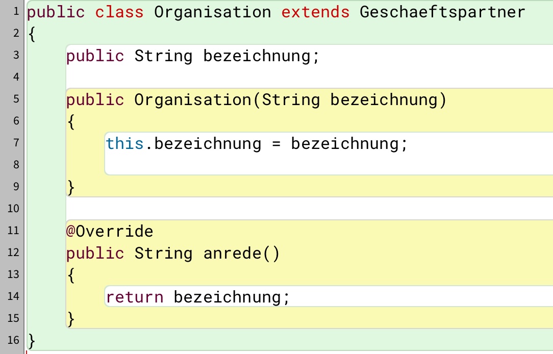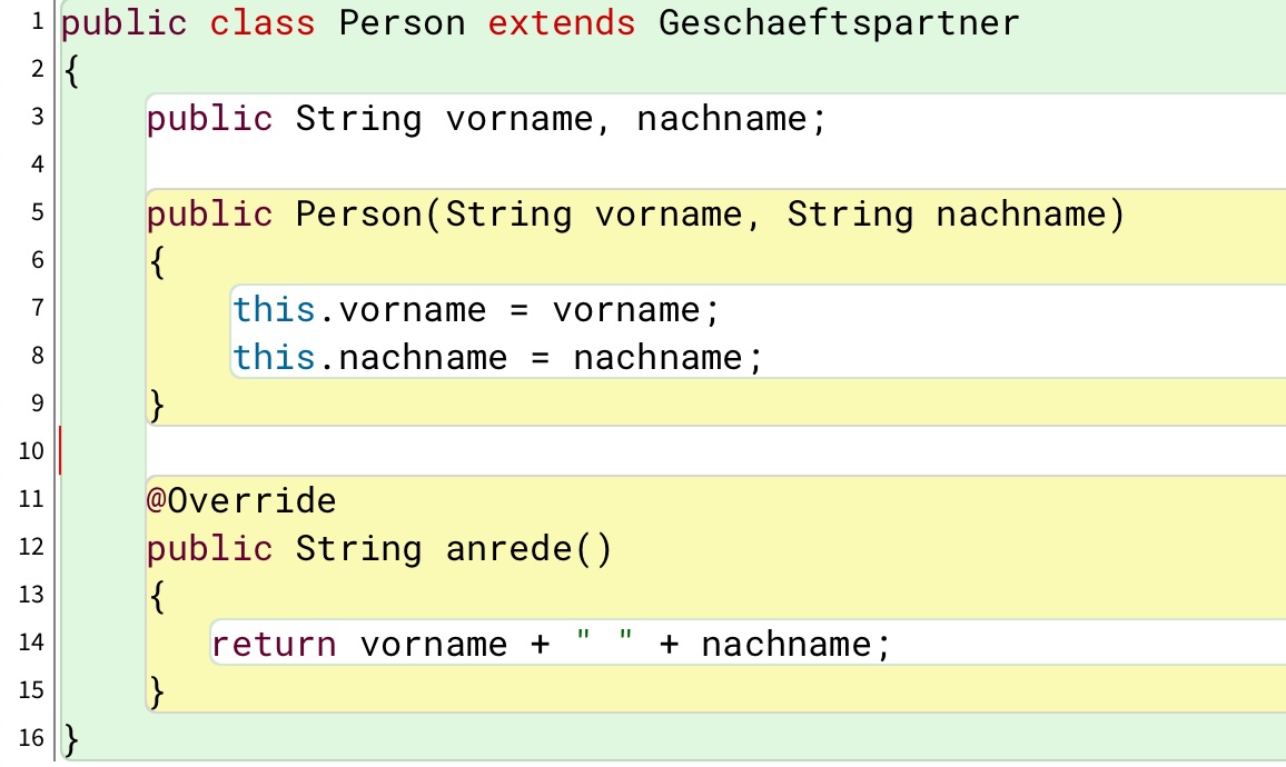 Die Annotation @Override zeigt uns, dass die Methode anrede() bereits als abstrakte Methode in der Oberklasse Geschaeftspartner existiert und von allen Unterklassen implementiert werden muss.