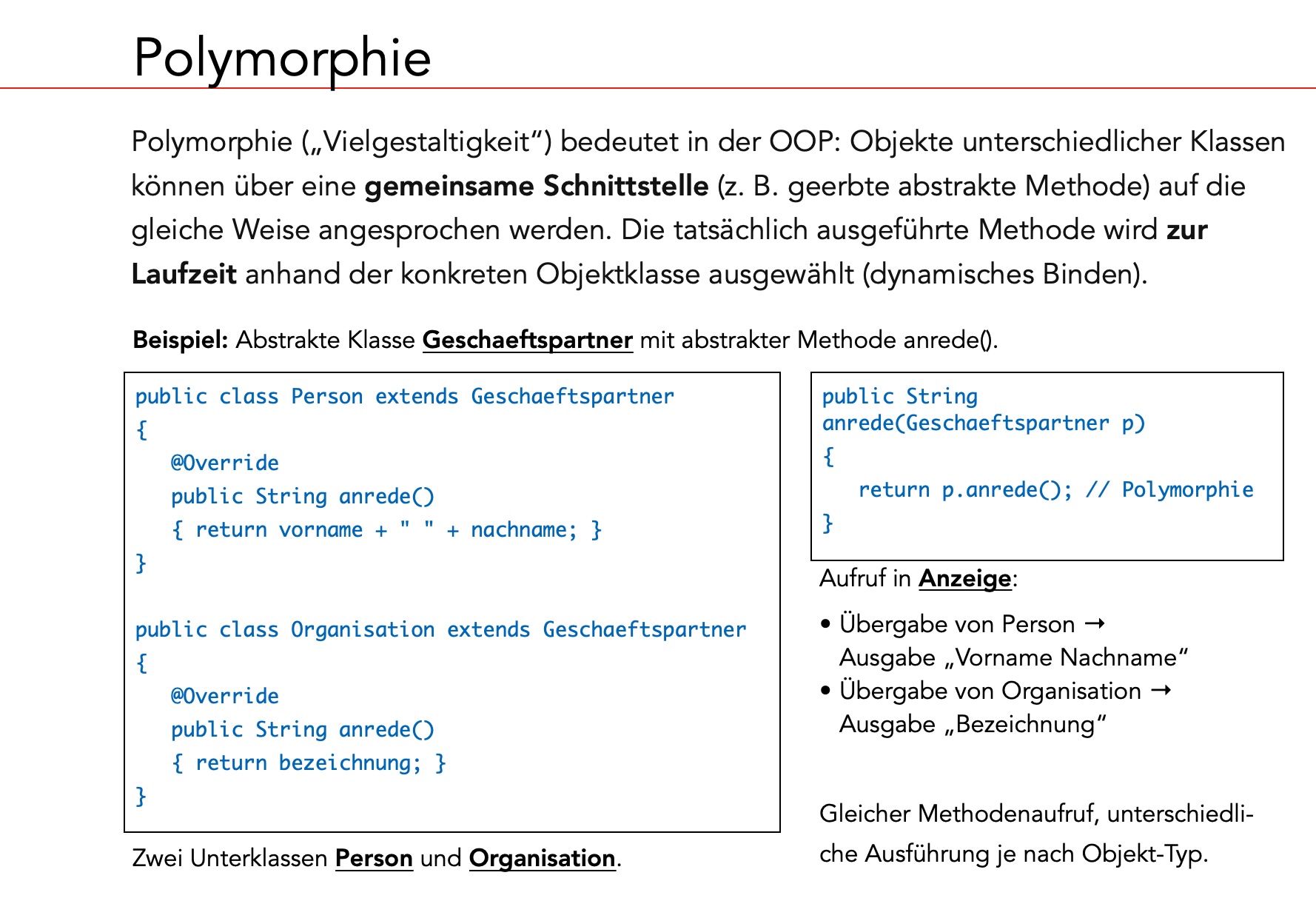 Die Klasse Anzeige kann dennoch einheitlich p.anrede() aufrufen – das ist Polymorphie: Die Auswahl der konkreten Methode erfolgt zur Laufzeit in Abhängigkeit vom tatsächlichen Objekttyp.