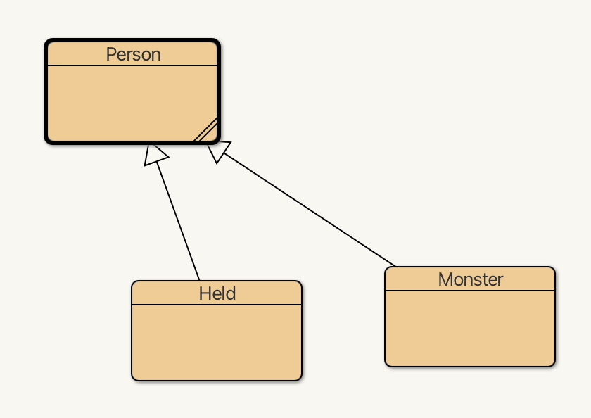 In diesem Fall sehen wir zwei Methoden findeGold() und trinkeHeiltrank(), die nur in der Unterklasse definiert wurden. In der Oberklasse Person existieren diese Methoden nicht.
