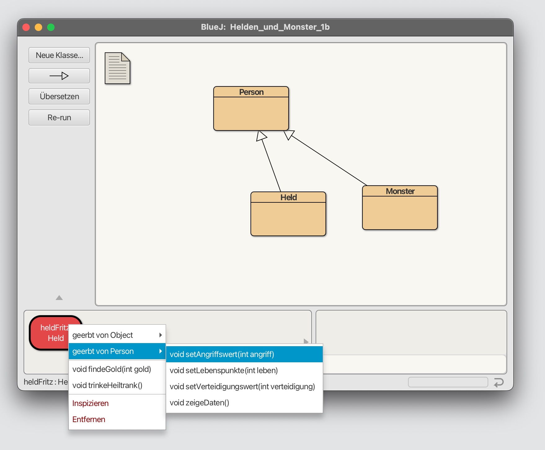 Legt man in BlueJ ein Objekt einer Unterklasse an, wie hier zum Beispiel das Objekt heldFritz der Klasse Held, dann kann man mit der rechten Maustaste alle öffentlichen Methoden der Unterklasse sehen.