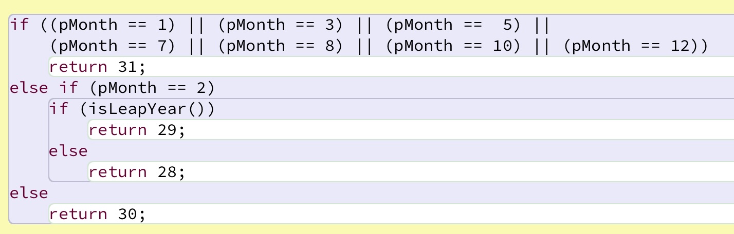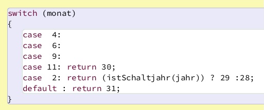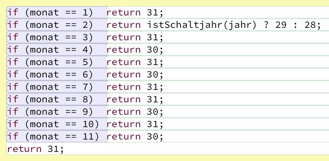 Betrachten wir nun zwei verschiedene Versionen der Methode tageImMonat() in der Klasse DatumRegeln. Hier die große if-else-Anweisung aus einer älteren Version dieser Klasse: