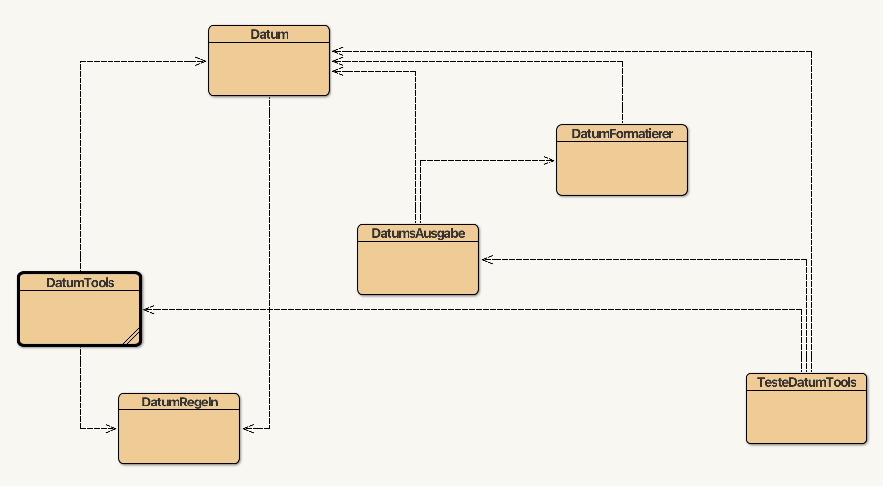 Auf die anderen Klassen - DatumTools, DatumsAusgabe, DatumFormatierer und TesteDatumTools - wollen wir an dieser Stelle nicht weiter eingehen, Thema dieser Seite ist die Überprüfung des Datums, also die Klasse DatumRegeln.