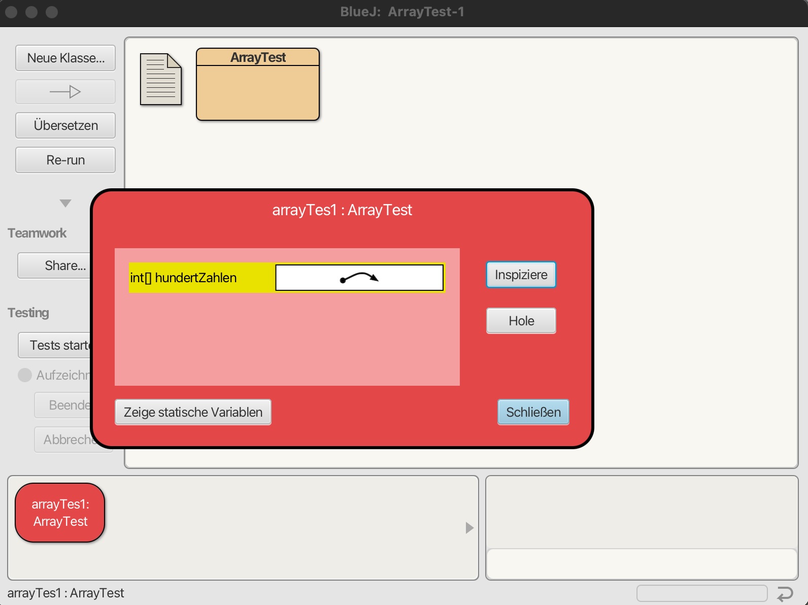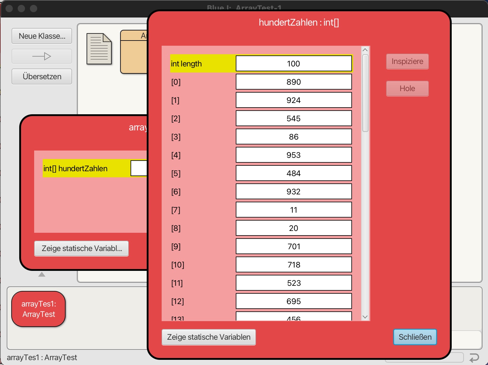 Mit Hilfe des Objektinspektors von BlueJ können wir uns diese 100 Zahlen ansehen, die in dem Array gespeichert sind. Dazu reicht ein Doppelklick auf den gebogenen Pfeil: