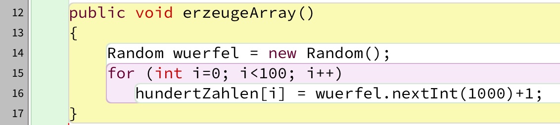 Die Zeilen 12 bis 17 des Programms erzeugen ein mit 100 Zufallszahlen gefülltes Array:
