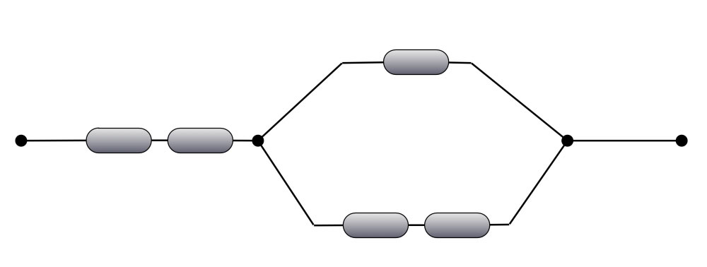 In dieser Aufgabe geht es um einfachste elektrische Schaltungen, die nur aus Widerständen bestehen, die in Reihe oder parallel geschaltet sind. In einer solchen Schaltung können Reihen- und Parallelschaltungen gleichzeitig und jeweils mehrmals vorkommen. Das folgende Bild zeigt zum Beispiel