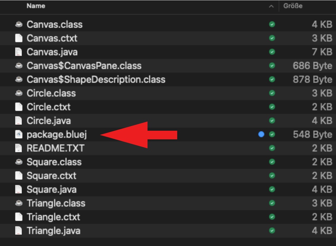 Dieses Bild zeigt den Inhalt des Verzeichnisses "Shapes", das nach Entpacken der ZIP-Datei entstanden ist. Wenn Sie BlueJ auf Ihrem Rechner korrekt installiert haben (bzw. wenn Ihr Admin das richtig gemacht hat), dann sollte ein Doppelklick auf die Datei "package.bluej" das Programm BlueJ mit dem Shapes-Projekt öffnen: