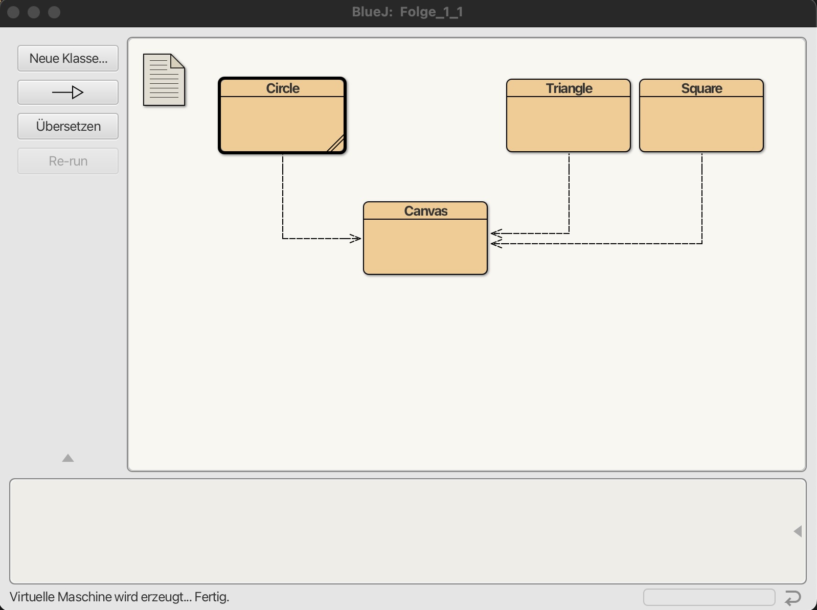 Den Hauptarbeitsbereich kann man fast nicht übersehen, er enthält im Augenblick die Symbole der vier Klassen Canvas, Circle, Square und Triangle sowie das Symbol einer Textdatei, in der Sie Notizen zum Projekt und zu den Klassen unterbringen können.