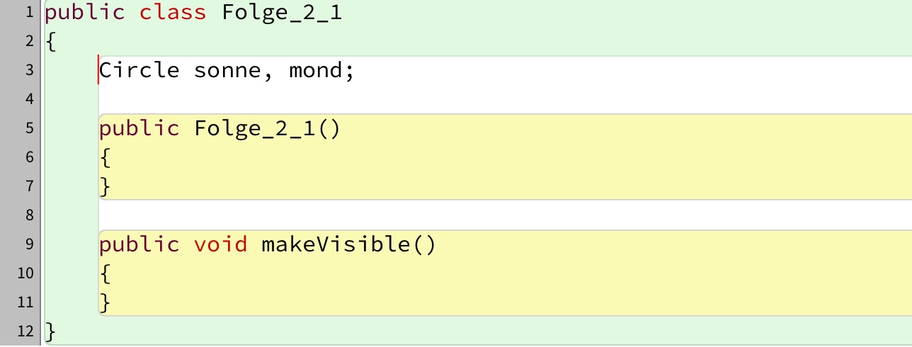 Der äußere Rahmen der gesamten Klasse Folge_2_1 ist hier grün hervorgehoben. Der Konstruktor dieser Klasse Folge_2_1() ist dagegen gelb markiert.