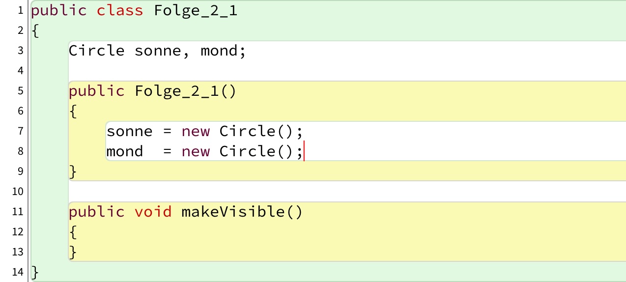 Wir haben jetzt in dem Quelltext der Klasse Folge_2_1 zwei Objekte sonne und mond der Klasse Circle deklariert. "Deklarieren" ist so viel wie eine Art "Bestellung". Wir bestellen quasi zwei Objekte der Klasse Circle und geben auch schon mal an, wie sie heißen sollen. Aber wir besitzen diese Objekte noch nicht, wir können also noch nicht mit ihnen arbeiten.