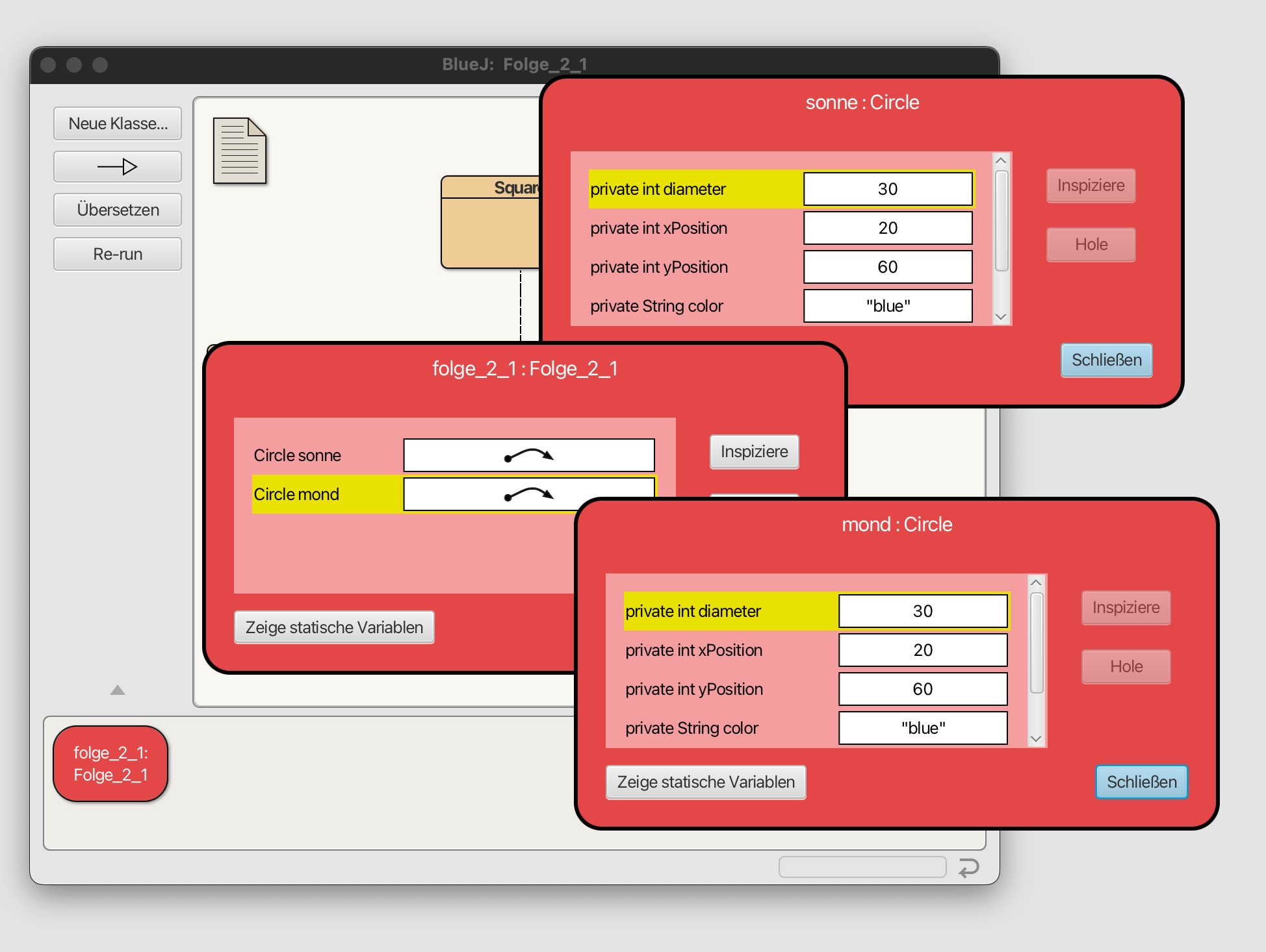 Das liegt daran, dass die beiden Objekte sonne und mond absolut gleiche Attributwerte haben. Das wiederum liegt an dem Konstruktor der Klasse Circle. In diesem Konstruktor werden die Attribute auf bestimmte vordefinierte Werte gesetzt.