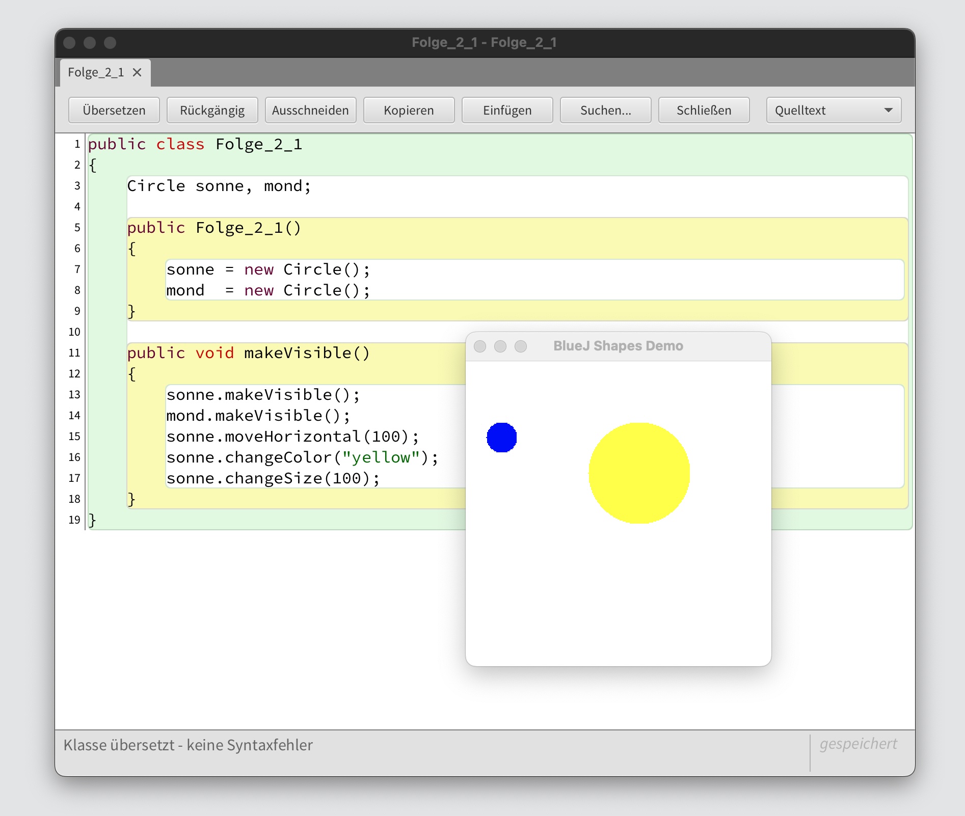 wird automatisch der Konstruktor dieser Klasse aufgerufen. Bei der Erzeugung des Objektes mond wird also der Konstruktor der Klasse Circle aufgerufen. Alle Anweisungen, die in diesem Konstruktor definiert sind, werden dann ausgeführt. Das Gleiche passiert in der nächsten Quelltext-Zeile, wenn das Objekt sonne erzeugt wird.