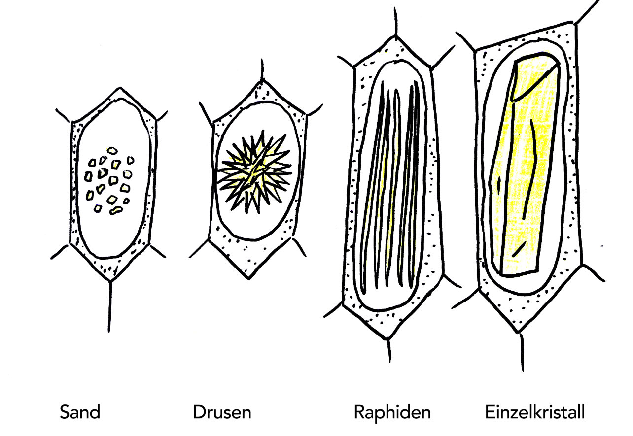 Verschiedene Kristallbildungen in der Vakuole einer Pflanzenzelle