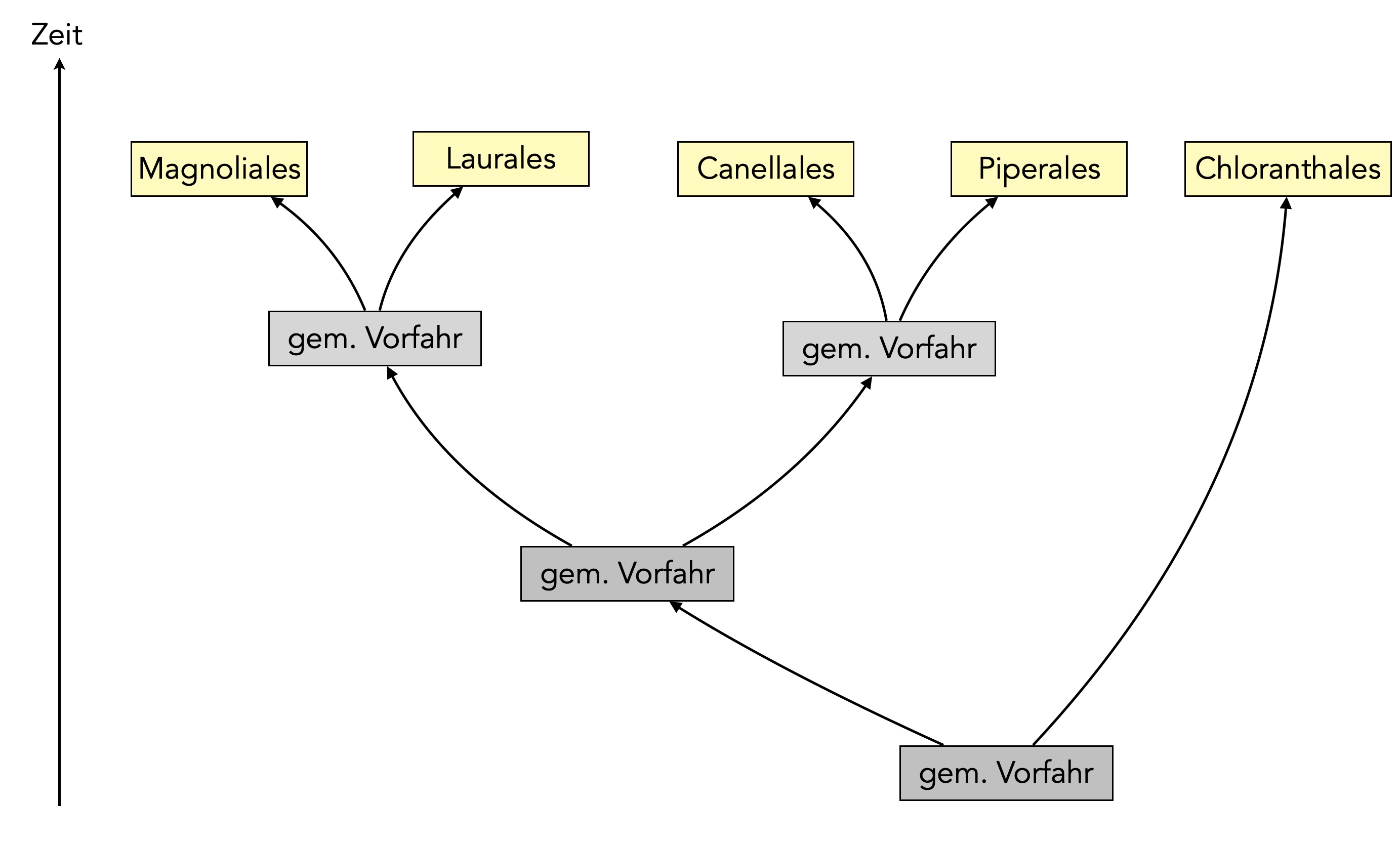 Die Chloranthales stammen direkt von dem gemeinsamen Urahnen aller Magnoliiden ab. Als Schwestergruppe der Chloranthales können dann die vier anderen Ordnungen angesehen werden, die sich in zwei Gruppen einteilen lassen.