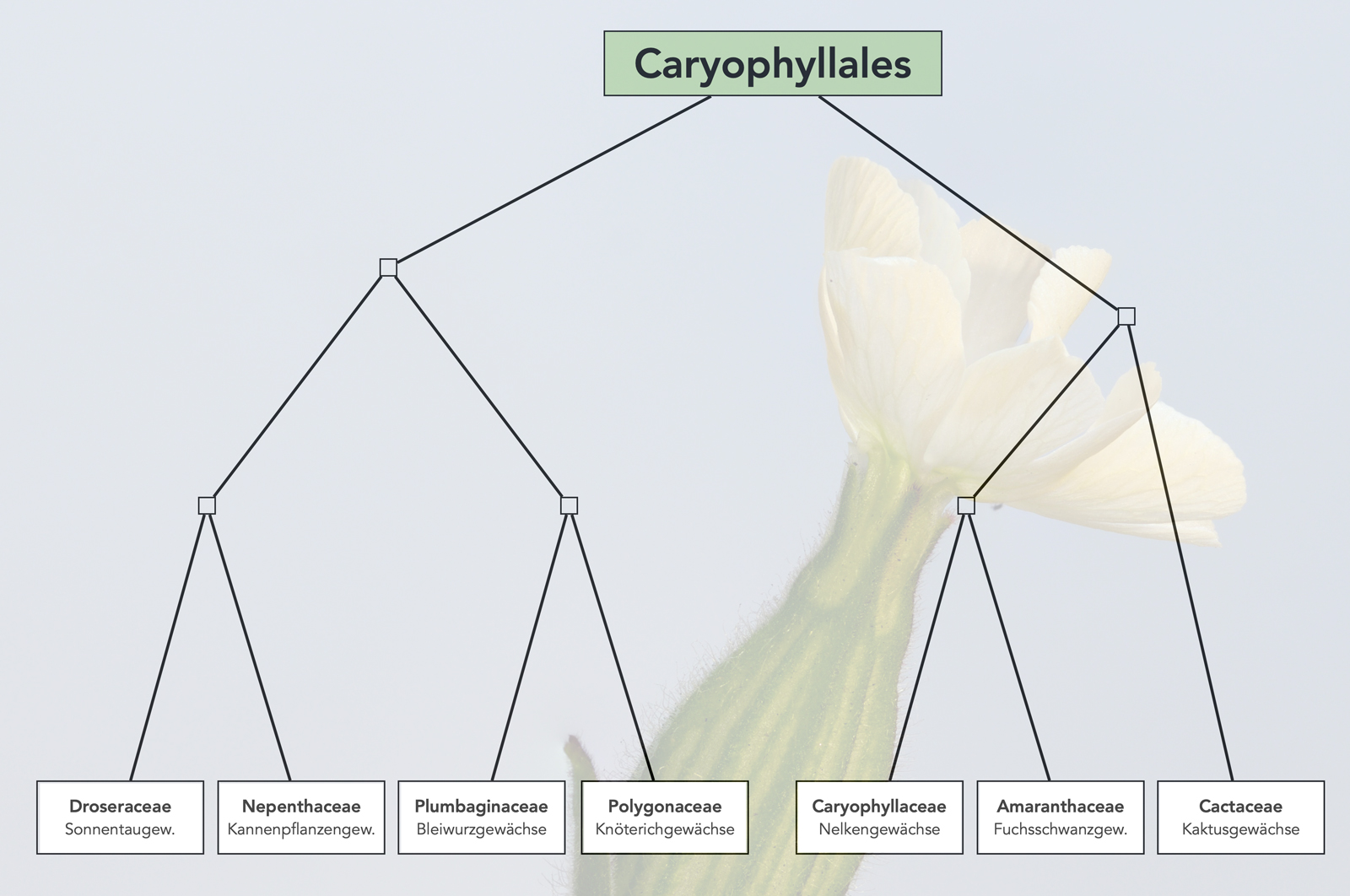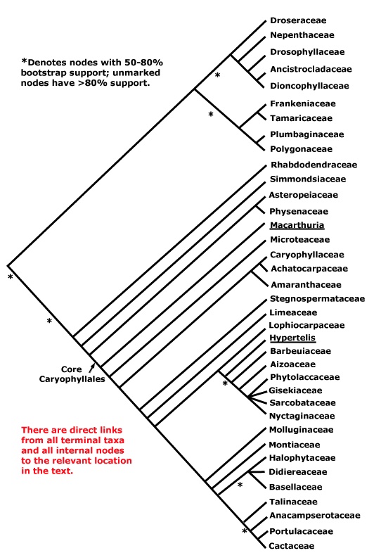 Interessant wäre jetzt eine genaue Darstellung der verwandtschaftlichen Verhältnisse innerhalb der Caryophyllales. Welches sind die basalen Familien, welche sind am weitesten "fortgeschritten"?