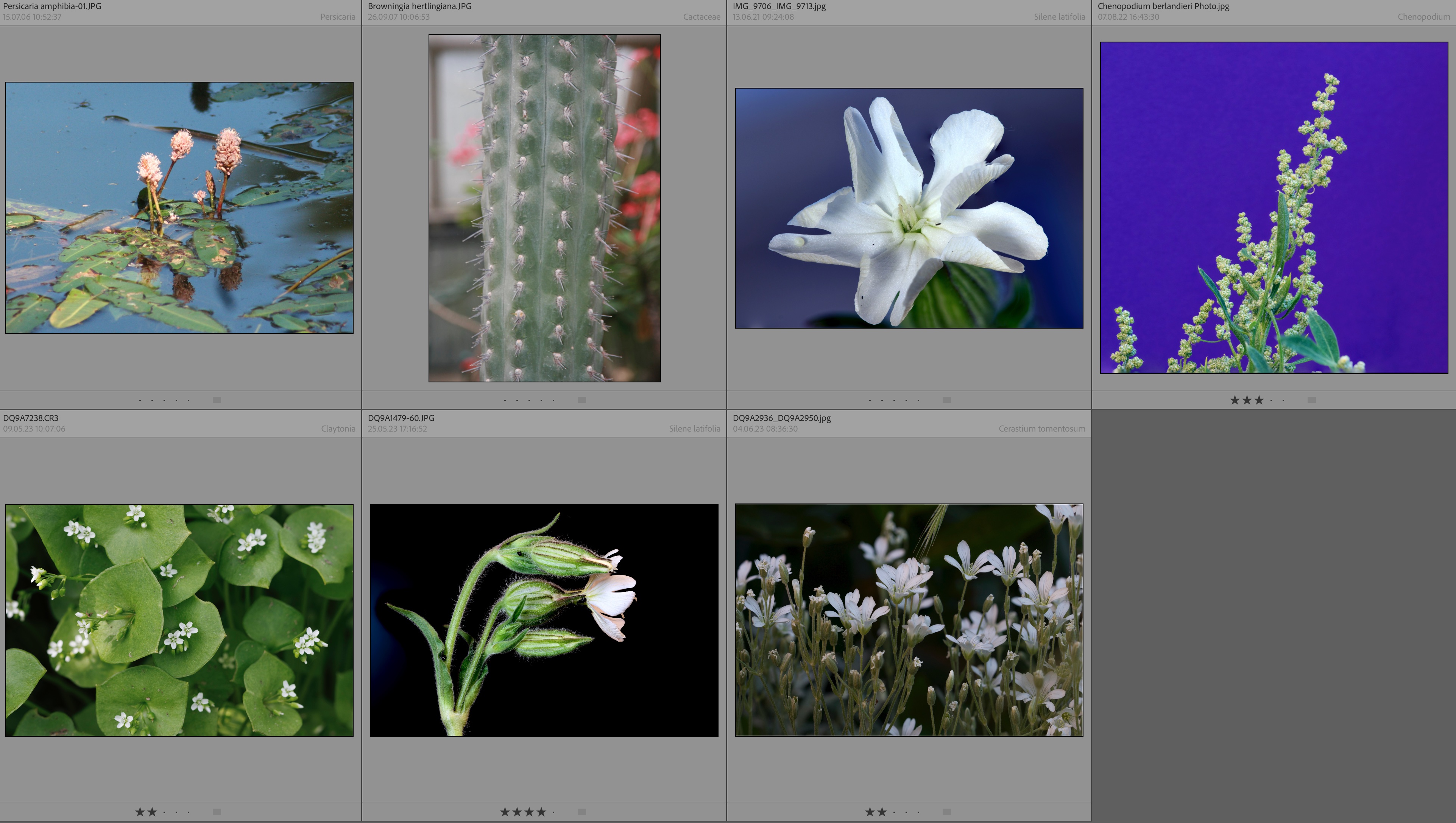 Diese Abbildung zeigt einen Screenshot meines virtuellen Herbariums, das viele Photos von Pflanzen umfasst, die ich in den letzten 20 Jahren mit meinen Kameras gemacht habe. Zu sehen sind hier sieben Vertreter und Vertreterinnen der Ordnung Caryophyllales. Von oben links nach unten rechts sehen wir: