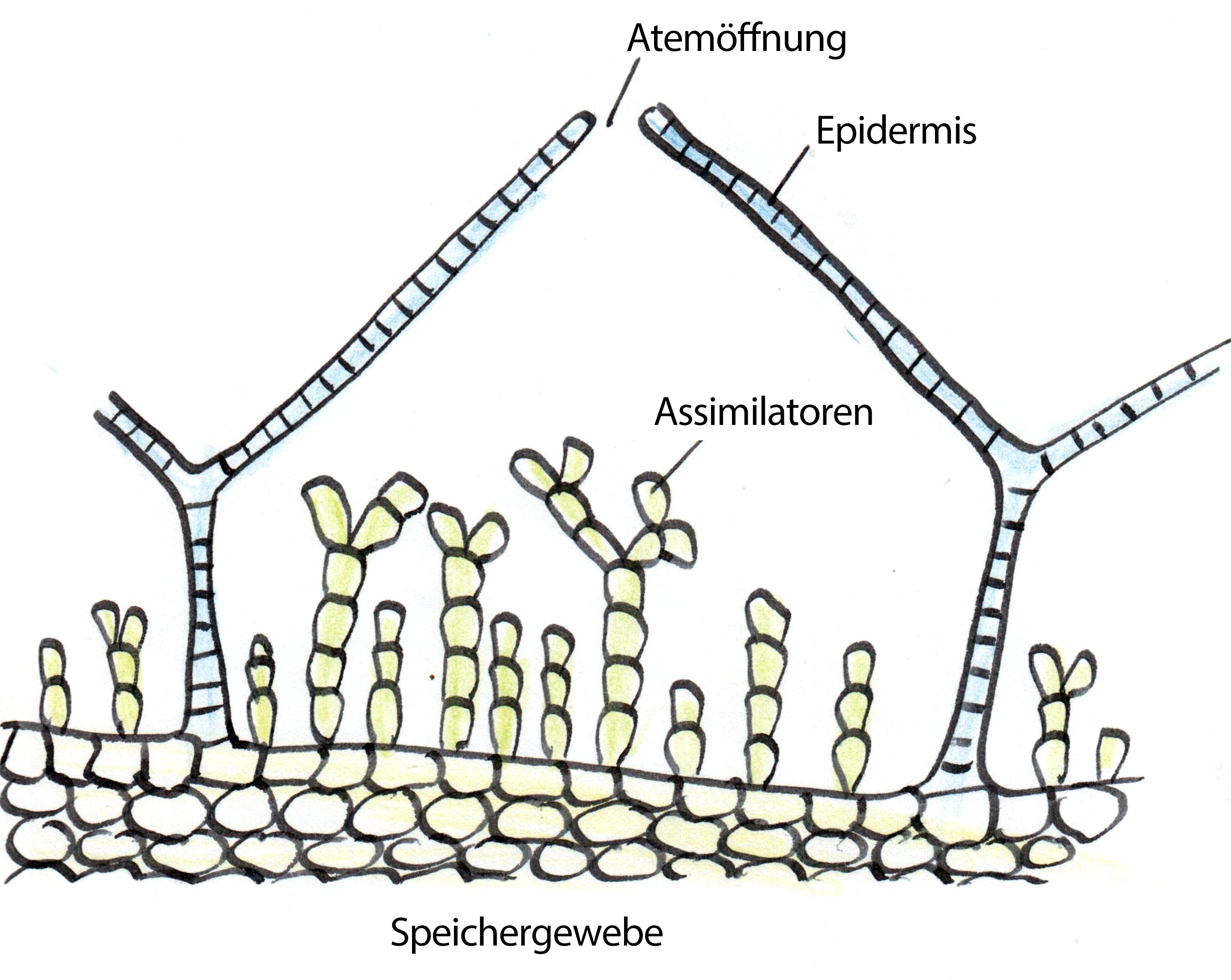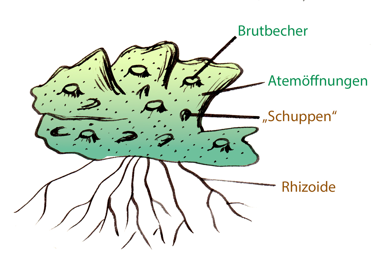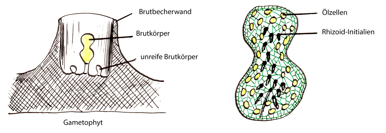 Charakteristische Strukturen des Gametophyten sind zunächst, wenn man die später noch zu besprechenden Antheridien- und Archegonienstände außer Acht lässt, die Brutbecher und die Atemöffnungen.