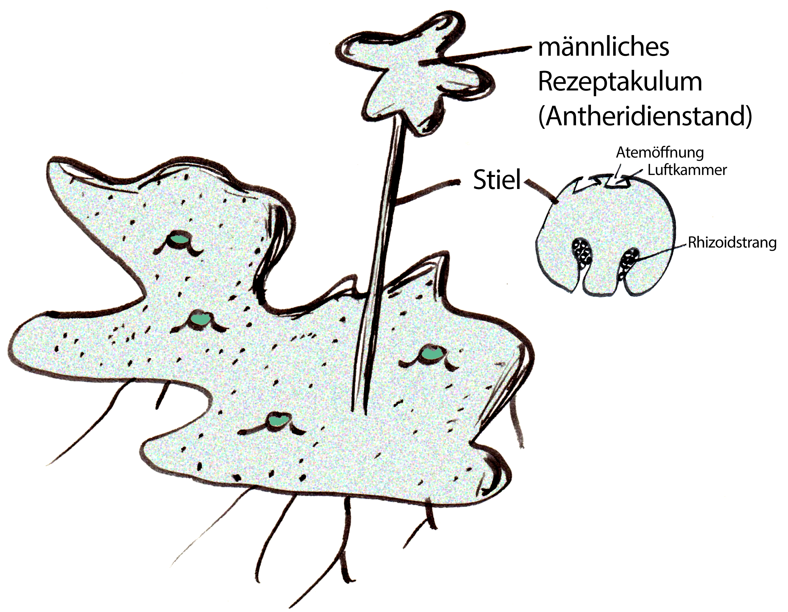 Dabei entstehen die Stiele der männlichen Receptacula oder Antheridienstände durch Einrollung des Thallus. Im Querschnitt erkennt man die Luftkammern und die Rhizoidstränge der ehemaligen Ober- bzw. Unterseite des Thallus.