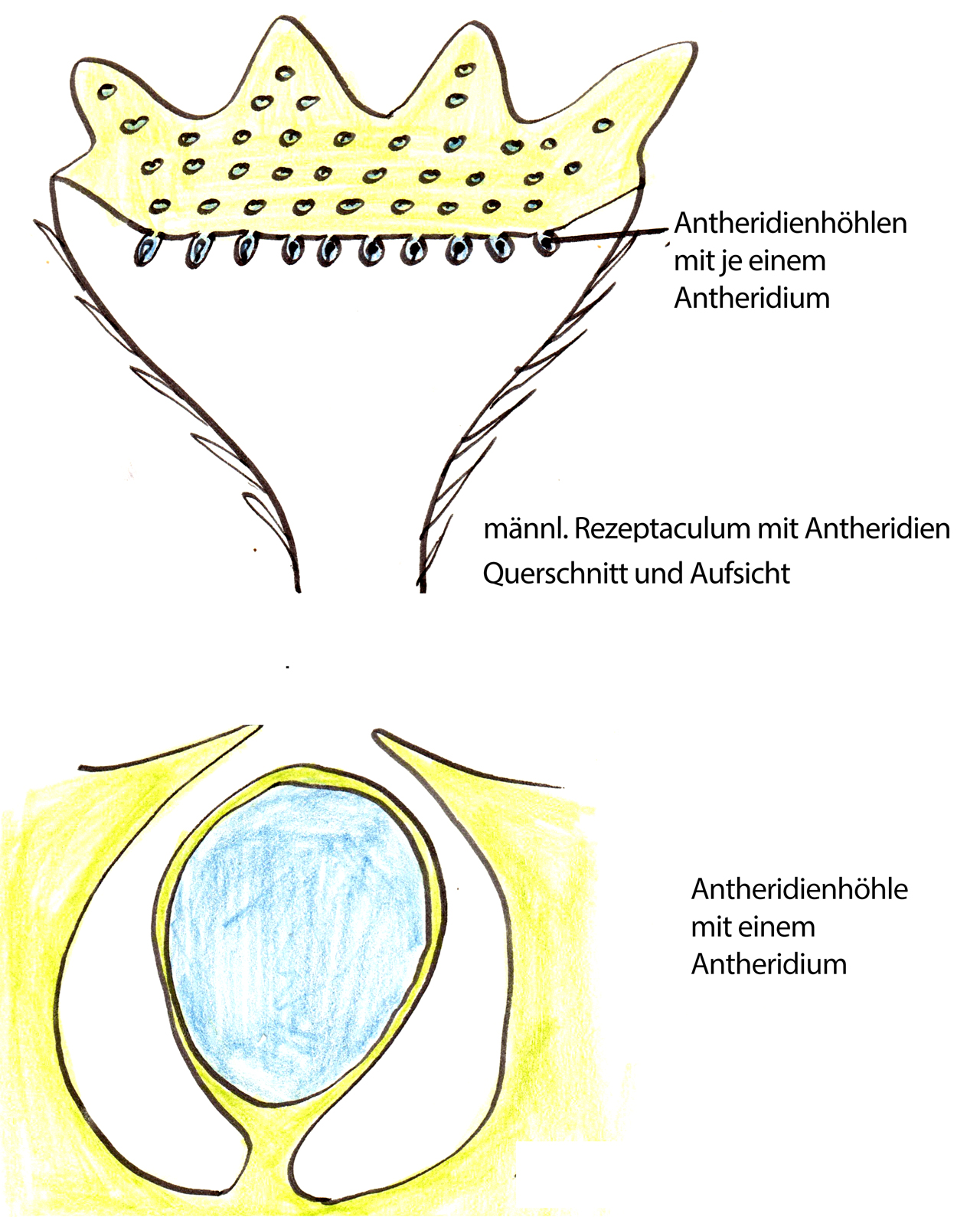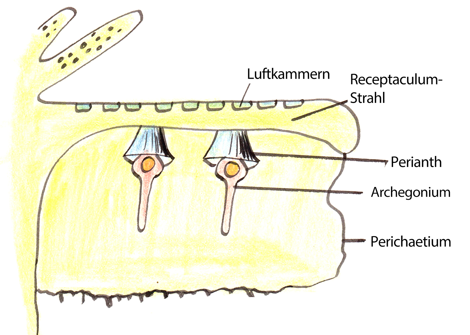 Dadurch kann man sich auch erklären, warum sich an der Oberseite der Receptaculum-Strahlen Luftkammern mit Öffnungen befinden, und warum die Archegonien nach unten und nicht nach oben weisen.