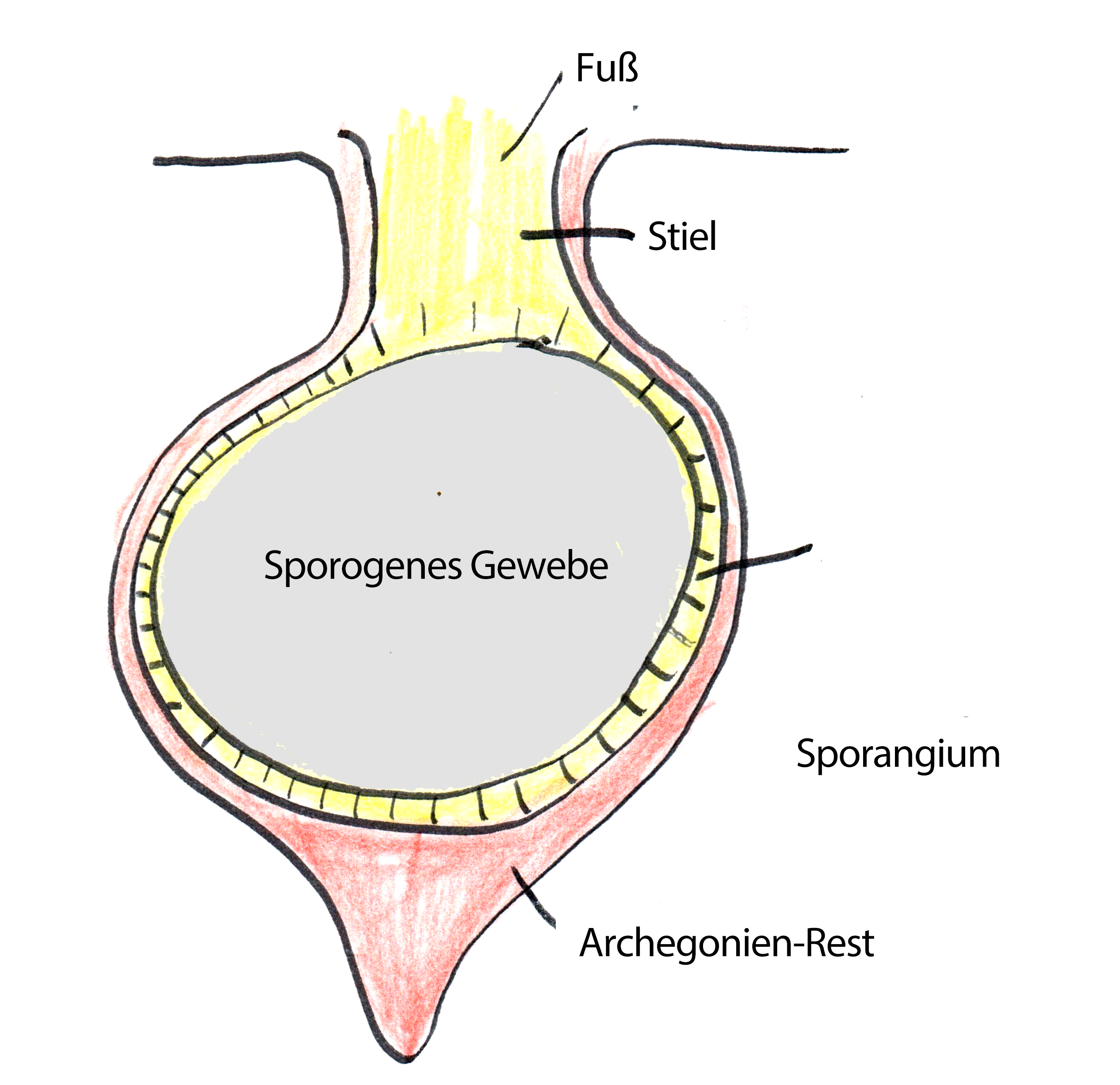 Nach der Befruchtung der Eizelle bildet sich innerhalb des Archegoniums ein diploider Sporophyt, der aus Sporangium mit Stiel und Fuß besteht: