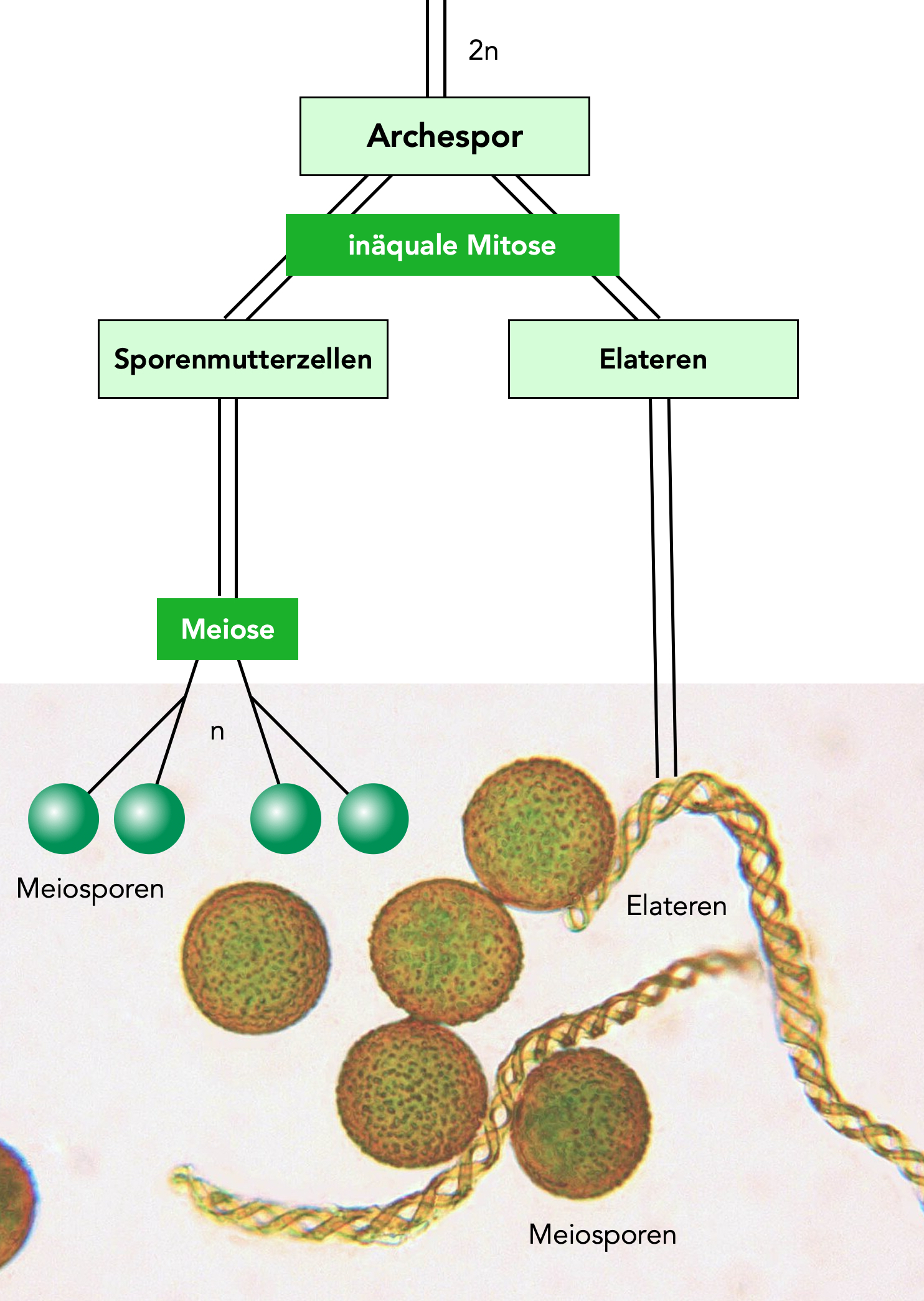 Bei der Bildung des sporogenen Gewebes entstehen neben den normalen Sporenmutterzellen sogenannte Elateren. Das sind schraubenförmige Schleuderfäden, die die späteren Sporen auflockern sollen und für die Ausstreuung der Sporen verantwortlich sind. Genau wie die Sporen selbst sind auch die Elateren diploid.