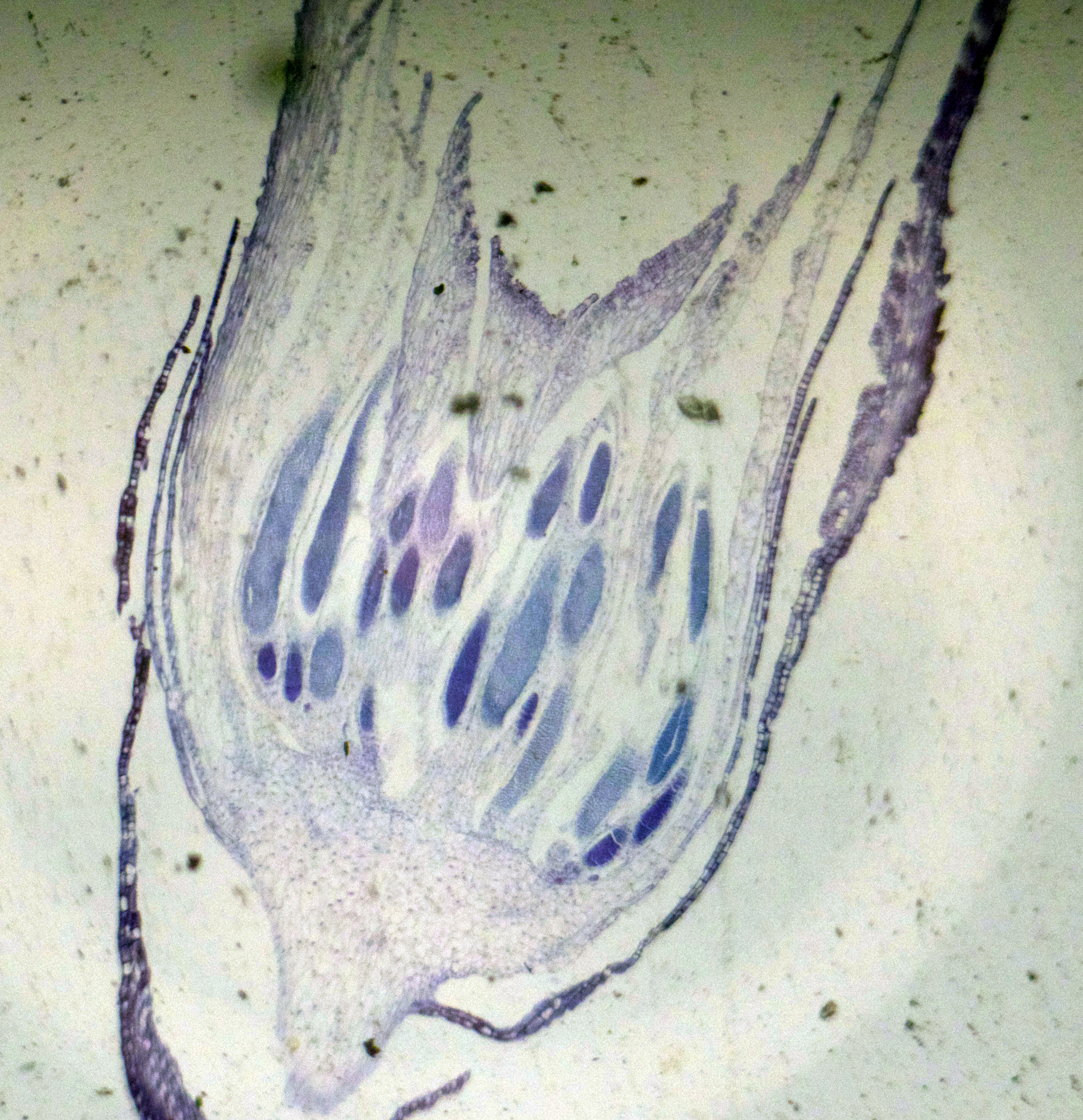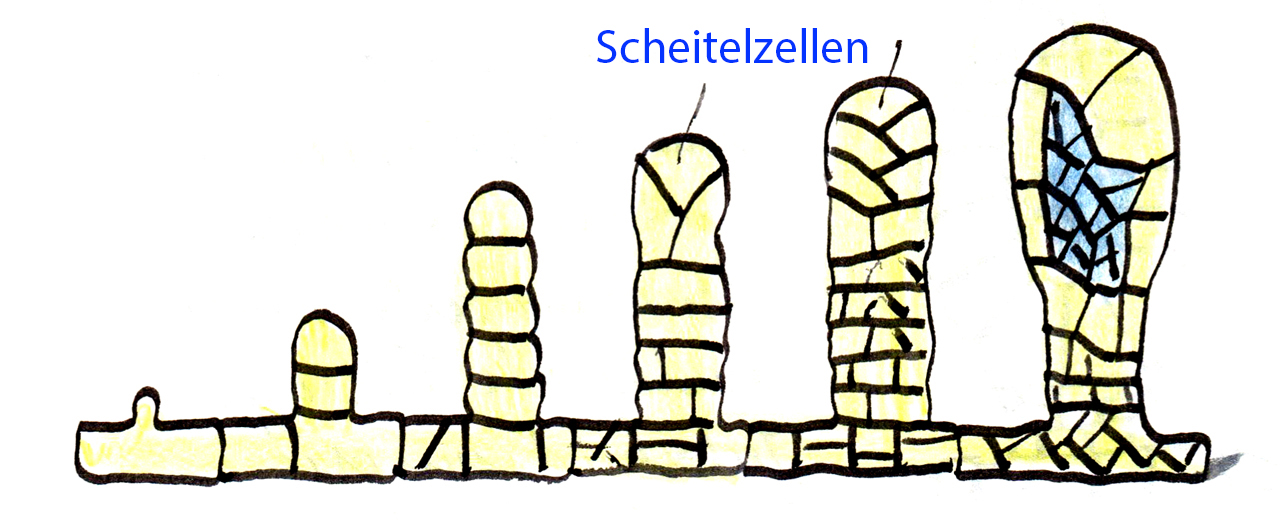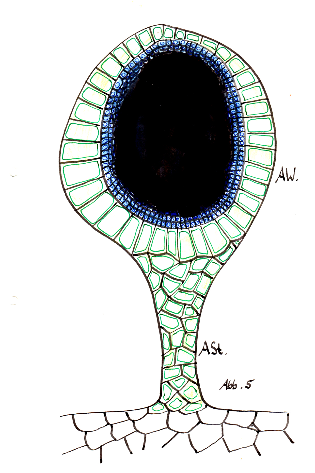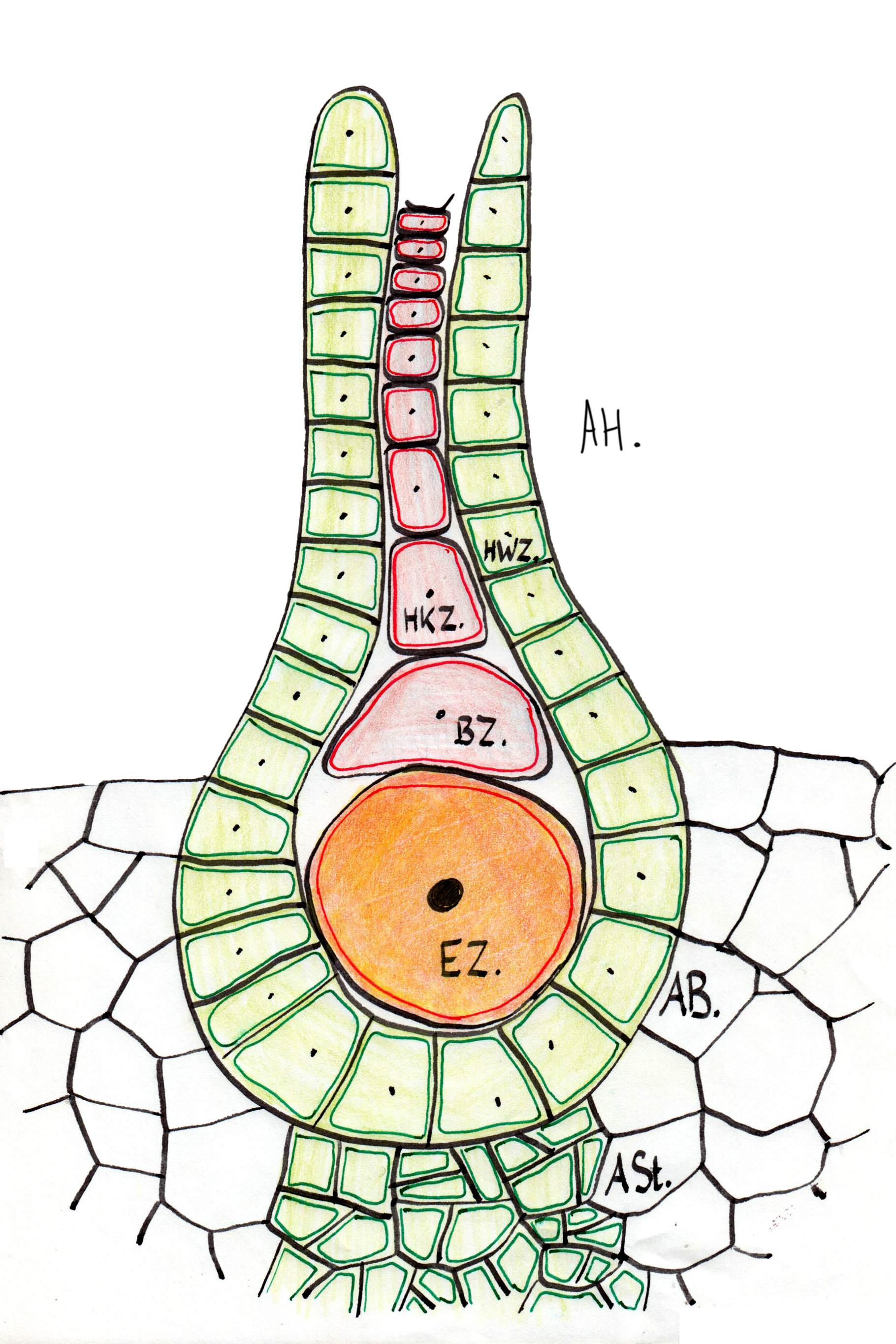Äußerlich kann man zwischen Archegonienhals (AH), -bauch (AB) und -stiel (ASt.) unterscheiden.
