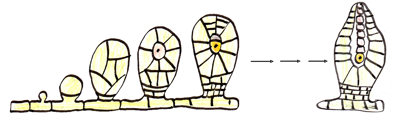 Eizelle, Bauchkanal- und Halskanalzellen entstehen aus der selben Ursprungszelle durch inäquale Teilungen.