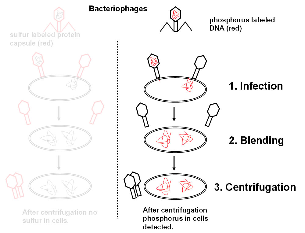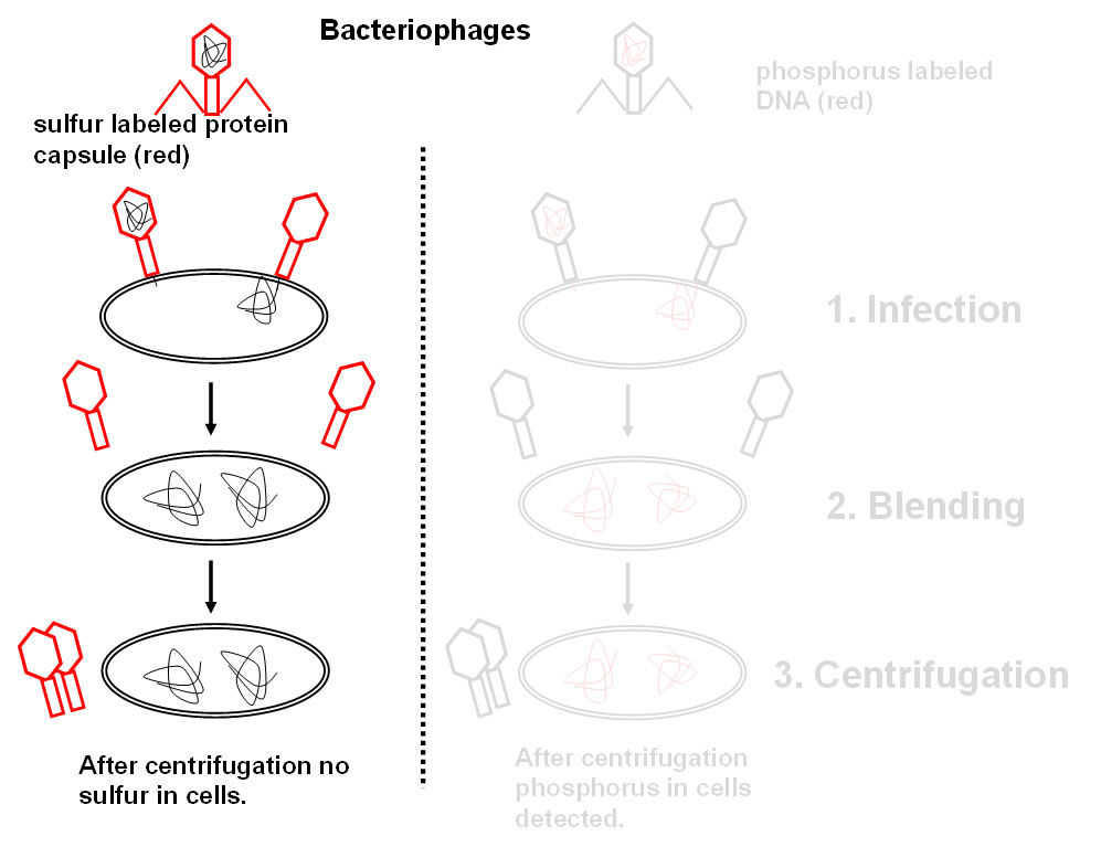 Mit Hilfe radioaktiver Markierung von Schwefel und Phosphor konnte nachgewiesen werden, dass die Radioaktivität nur dann in Bakterienzellen eindringt, wenn der Phosphor markiert wurde. Damit wurde bewiesen, dass die DNA für die Erzeugung neuer Phagen verantwortlich ist - DNA ist der physikalische Träger der Erbinformation.