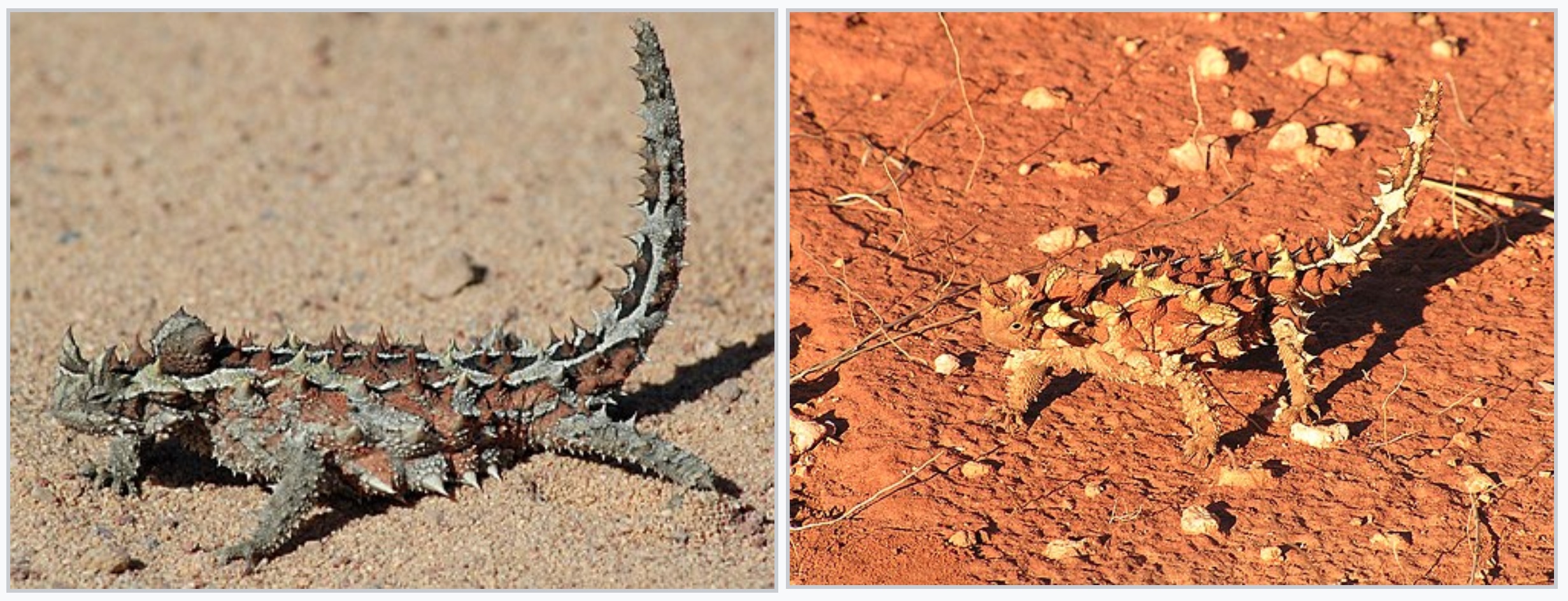 Dieses Bild aus der Wikipedia zeigt, dass die Farben des Dornteufels an den Untergrund des Lebensraumes des jeweiligen Individuums angepasst sind.