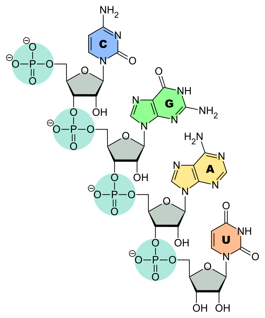 Vier Nukleotide mit je verschiedener Base (C, G, A, U) in N-glykosidischer Bindung