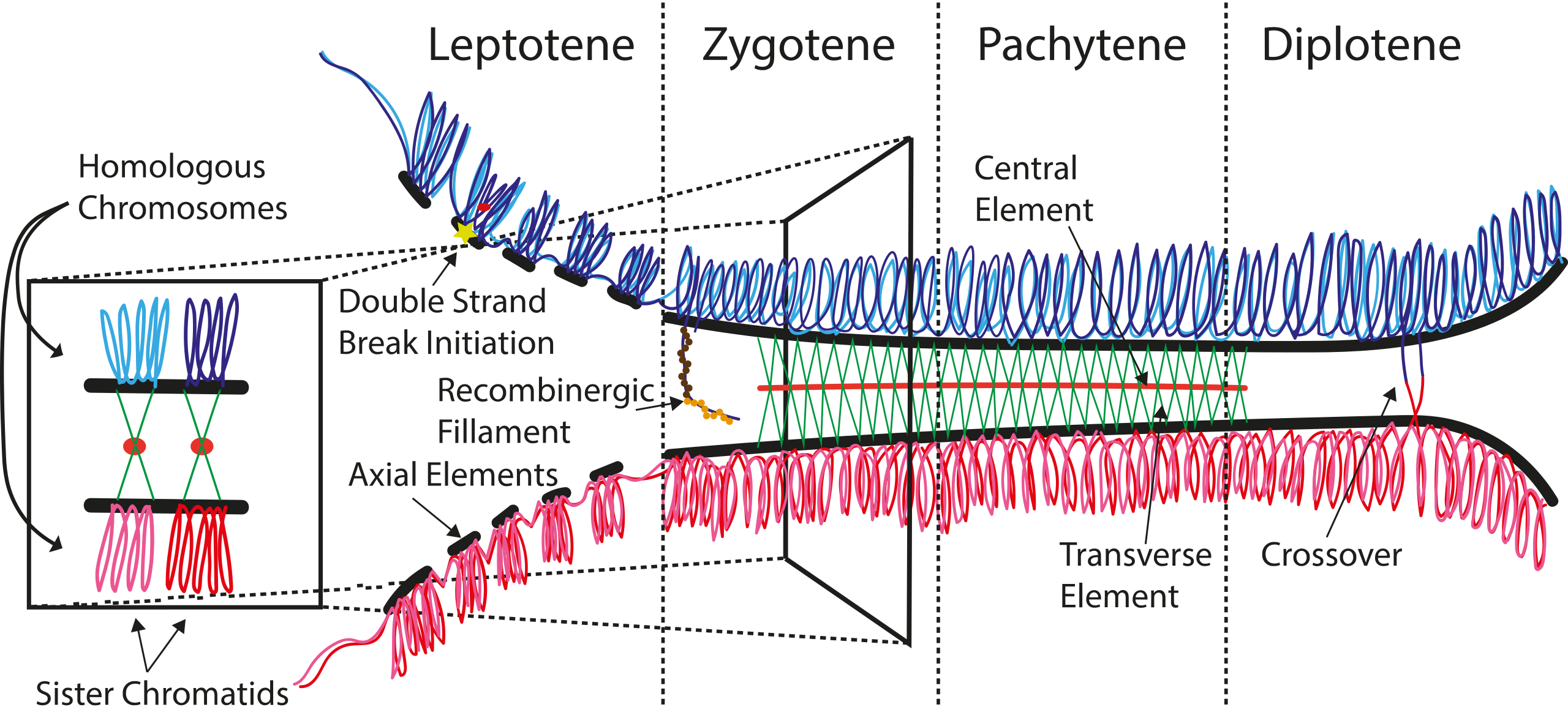 In diesem Bild aus dem Wikipedia-Artikel "Synaptonemal complex" sieht man sehr schön, wie sich der synaptonemale Komplex im Laufe der Prophase-Stadien Leptotän, Zygotän, Pachytän und Diplotän entwickelt. Einzelheiten dazu finden Sie auf der genannten Wikipedia-Seite.