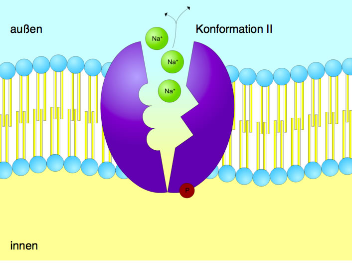 Bei der Spaltung des ATP wird genug Energie freigesetzt, um die Konformation des Proteins zu verändern. Das abgespaltene Phosphat wirkt dabei wie ein positiver Effektor, wie ein Aktivator. Durch die Konformationsänderung öffnet sich das Pumpenprotein nach außen hin. Die drei Natrium-Ionen lösen sich aus ihren Bindungsstellen und gelangen in das Außenmedium.