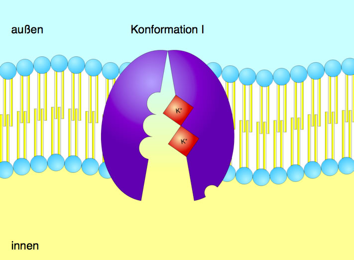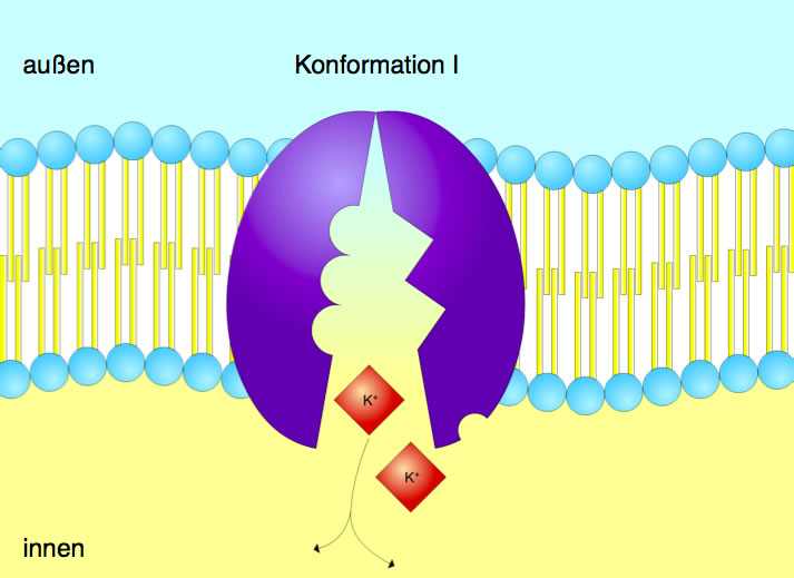 Die Kalium-Ionen lösen sich aus ihren Bindungsstellen und gelangen in das Cytoplasma. Der ursprüngliche Zustand ist wieder hergestellt; es können erneut 3 Na+-Ionen und ein ATP-Molekül gebunden werden.
