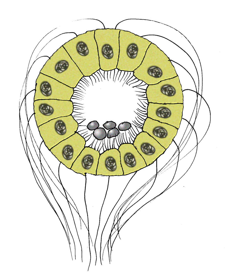 In diesem Hohlraum befindet sich eine Flüssigkeit mit ein paar kleinen Statolithen. Diese Statolithen sind meistens Sandkörner oder Kalkpartikel. Wegen der Schwerkraft liegen die Statolithen stets auf den Sinneszellen, die sich gerade "unten" befinden. Die Sinneshaare dieser Mechanorezeptoren werden dadurch ausgelenkt und senden Aktionspotenziale zum ZNS. Die anderen Mechanorezeptoren, die keinen Druck durch die Statolithen verspüren, senden keine Informationen zum ZNS. Auf diese Weise kann das Tier feststellen, wo oben und unten ist und sich entsprechend orientiern. Ersetzt man die Statolithen durch Eisenspäne, dann kann man man mit Hilfe eines Magneten Verwirrung bei den Tieren stiften. Die Eisenspäne werden nämlich durch den Magneten nach oben gezogen und reizen dann die Mechanorezeptoren im oberen Bereich des Statocysten. Die Tiere legen sich dann auf den Rücken oder schwimmen sogar in Rückenlage [1].