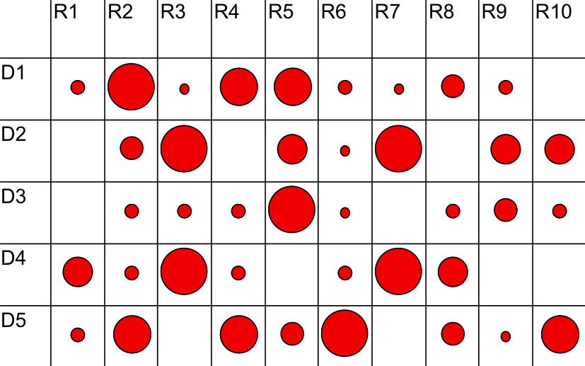 Hier hat man folgendes Experiment gemacht: Die Zellkörper von zehn verschiedenen Mitralzellen wurden mit Mikroelektroden "angezapft" und die Rezeptorpotenziale R1, R2, …, R10 wurden gemessen. In der Tabelle werden die unterschiedlich starken Rezeptorpotenziale durch unterschiedlich große Kreise dargestellt.
