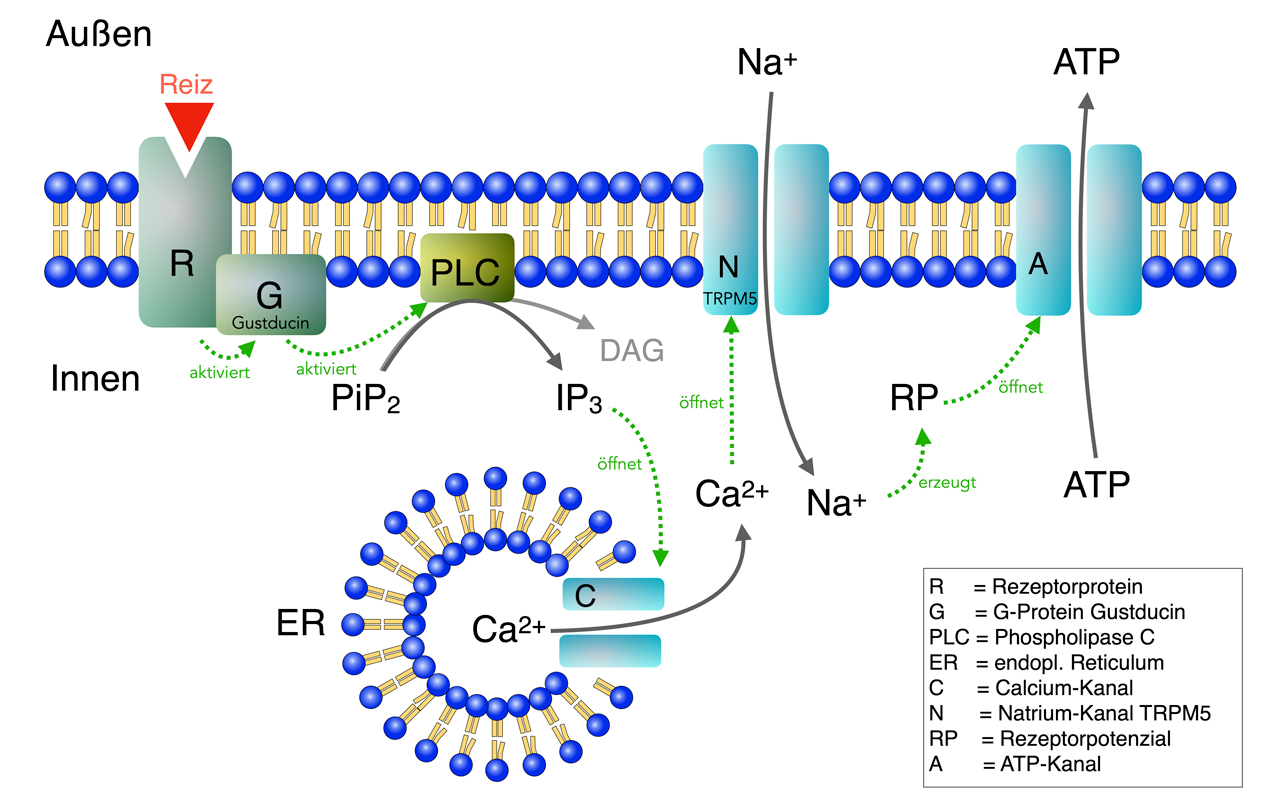 Das IP3wiederum öffnet Calcium-Kanäle (C) im endoplasmatischen Reticulum (ER), die daraufhin Ca2+-Ionen in das Cytoplasma entlassen. Diese Calcium-Ionen setzen sich an spezifische TRPM5-Natrium-Kanäle (N) und öffnen diese, so dass Na+-Ionen in die Zelle strömen. Dadurch wird die Zellmembran depolarisiert, es entsteht ein Rezeptorpotenzial (RP). Dieses Rezeptorpotenzial führt dann zur Öffnung bestimmter ATP-Kanäle, durch die ATP nach außen strömt und hier wie ein Neurotransmitter wirkt.