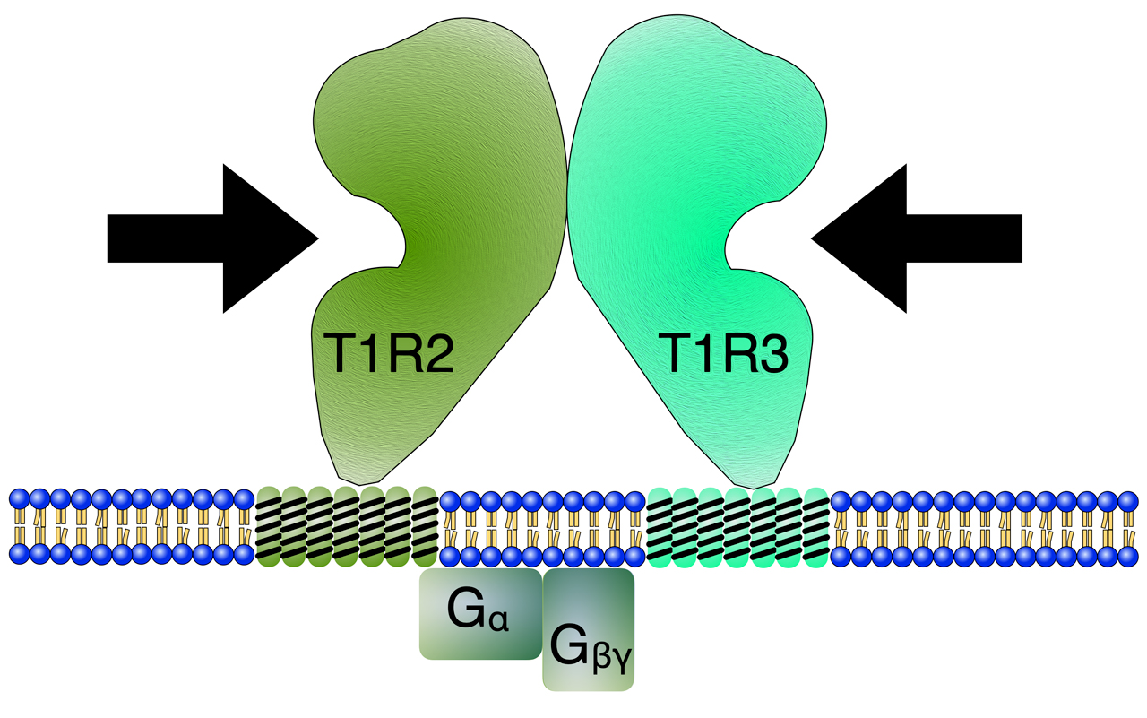 Geschmackssinneszellen (TRCs, taste-receptor cells), die für die Empfindung "süß" zuständig sind, exprimieren zwei Rezeptorproteine, die als T1R2 und T1R3 bezeichnet werden (taste receptor type 1 member 2 / member 3). Diese Rezeptorproteine treten als Heterodimer T1R2/T1R3 auf, sitzen in der Membran der apikalen Mikrovilli der Geschmackssinneszellen und sind auf der Membraninnenseite an ein G-Protein gekoppelt [1, 2], das als Gastducin bezeichnet wird.