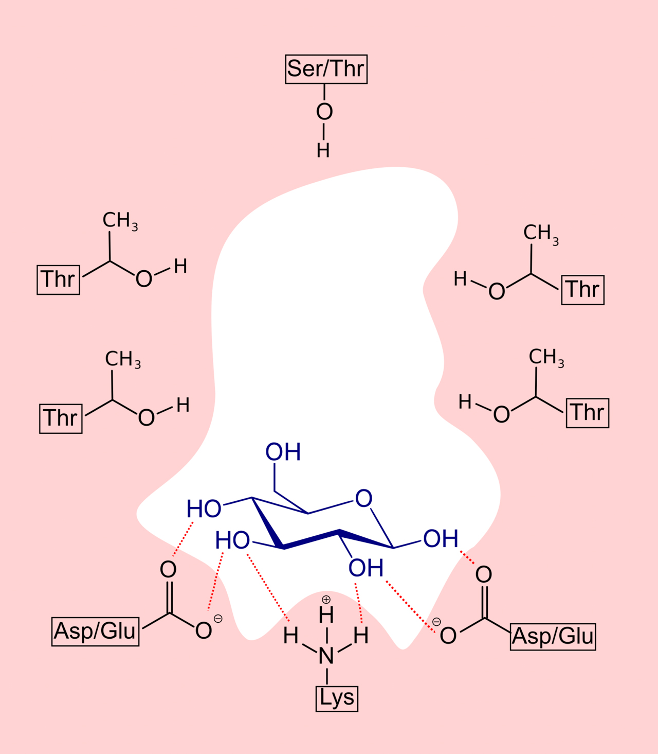 Auf dieser Zeichnung aus der deutschen Wikipedia sieht man ein Glucose-Molekül in einer "Tasche" eines der beiden Rezeptorprotein-Einheiten. Vier der OH-Gruppen der Glucose werden von drei Aminosäuren des Rezeptorproteins nicht-kovalent gebunden. Insgesamt stehen acht Aminosäuren für die Bindung von süßen Verbindungen zur Verfügung. Dies erklärt, warum auch deutlich größere Moleküle als Glucose als "süß" empfunden werden.