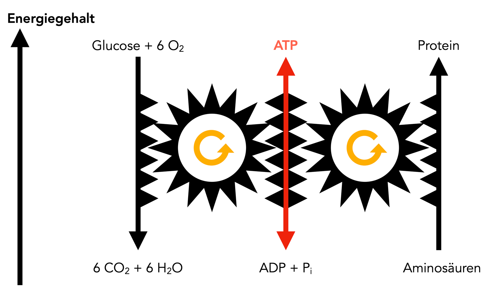 Die Zahnrad-Symbolik ist notwendig, um zu verdeutlichen, dass der abbauende Vorgang den aufbauenden Vorgang antreibt. Das mittlere Zahnrad vermittelt sozusagen die übertragene Energie.
