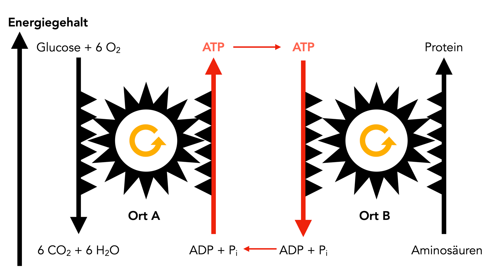 Die ATP-Synthese findet an Ort A statt (Mitochondrien), dann wird das ATP zum Zielort B (Ribosomen) transportiert, und dort findet dann die ATP-Zerlegung zur Energiegewinnung statt.