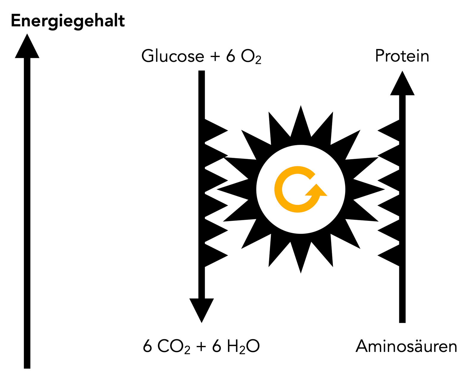 Wenn an den Ribosomen ein neues Protein entsteht, ist das ein anabolischer Vorgang, es wird ein komplexes Molekül aufgebaut. Das gebildete Protein hat einen höheren Energiegehalt als die einzelnen Aminosäuren zusammen, das wird durch den nach oben gerichteten Pfeil verdeutlicht.