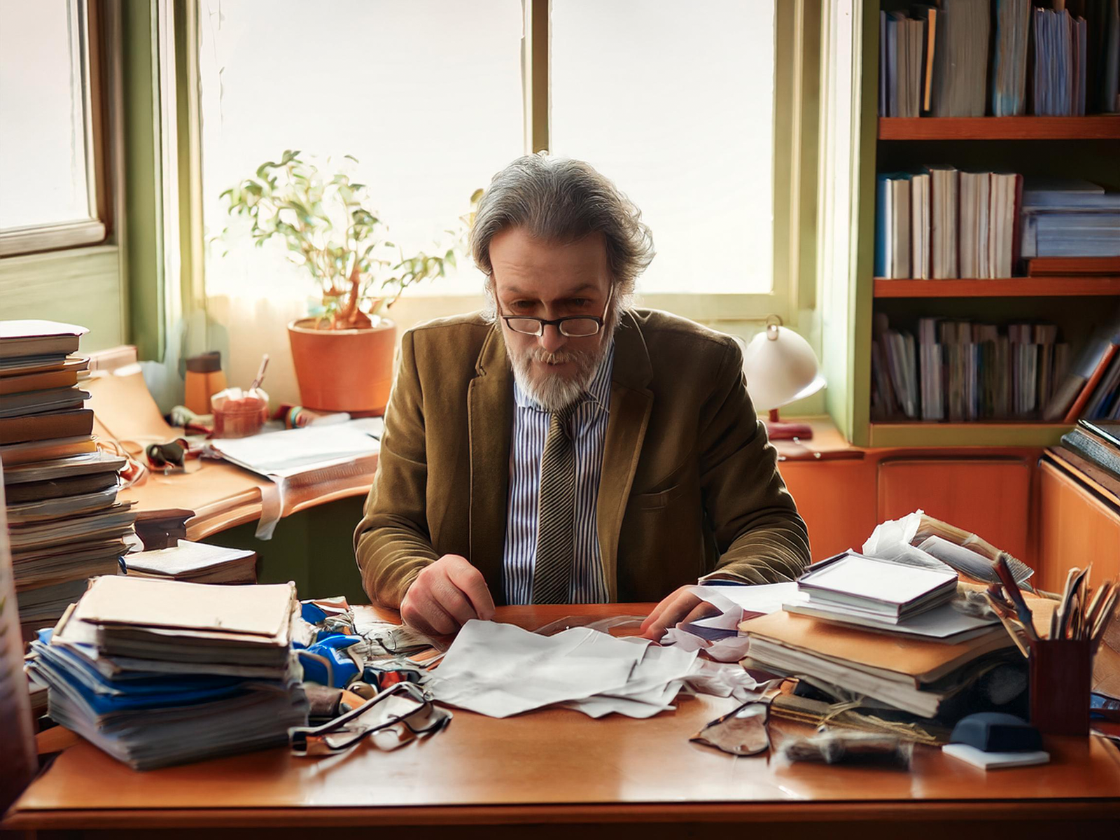Dieses schöne Bild, das ich eben mit Photoshop 2025 generiert habe, zeigt das Arbeitszimmer eines Lehrers, der an einem extrem unaufgeräumten Schreibtisch sitzt. So ähnlich sieht das bei mir auch aus, während ich gerade diesen Text schreibe.