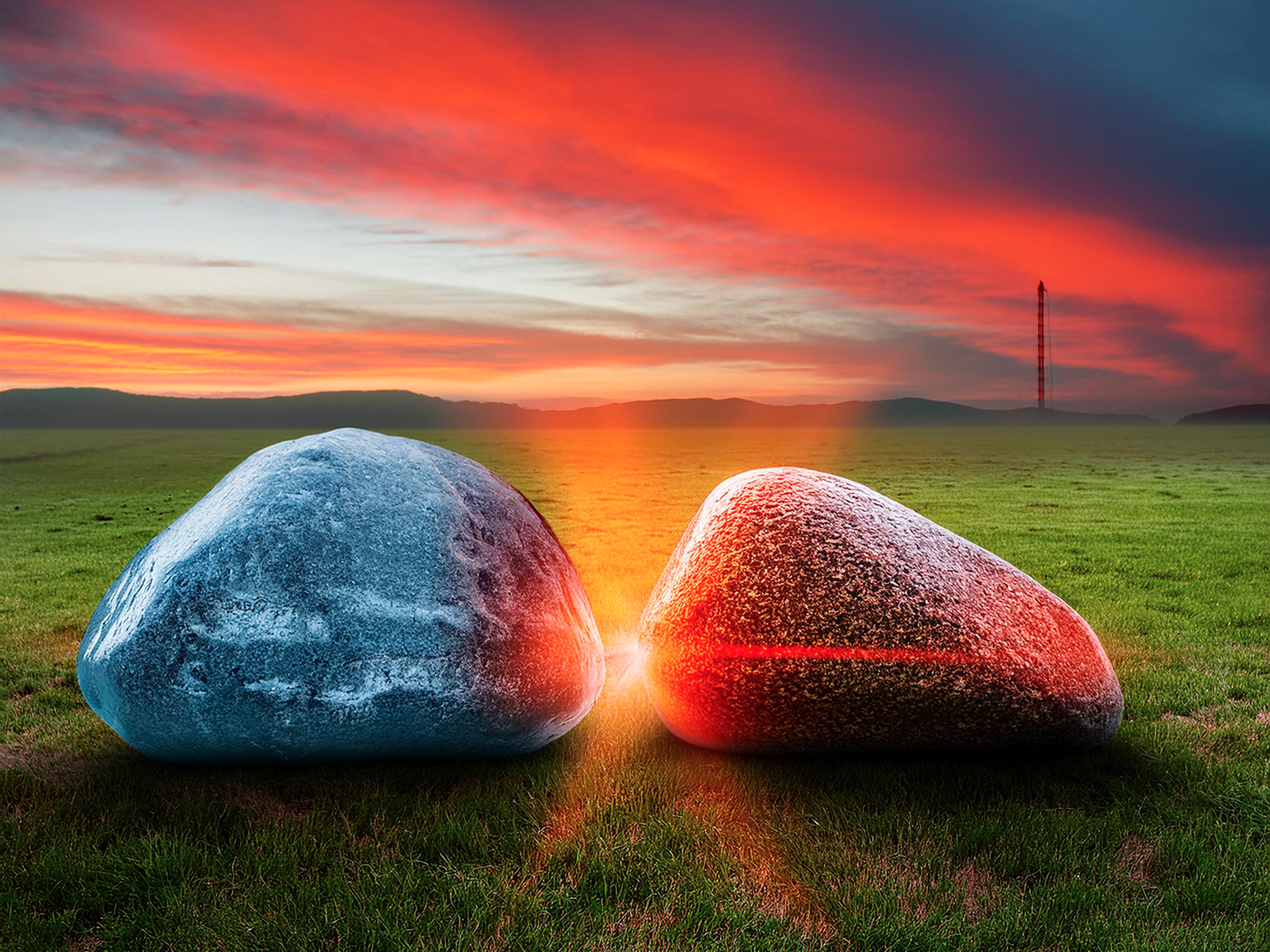 Hier sehen wir zwei Steine, die auf einer Wiese nebeneinander liegen. Auch dieses Bild wurde wieder von Photoshop generiert. Der linke Stein ist eiskalt, von einer Eisschicht überzogen. Der rechte Stein ist glühend heiß. Dies ist ein Zustand geringer Entropie - also sehr aufgeräumt. Die Kälte ist links, die Hitze rechts.