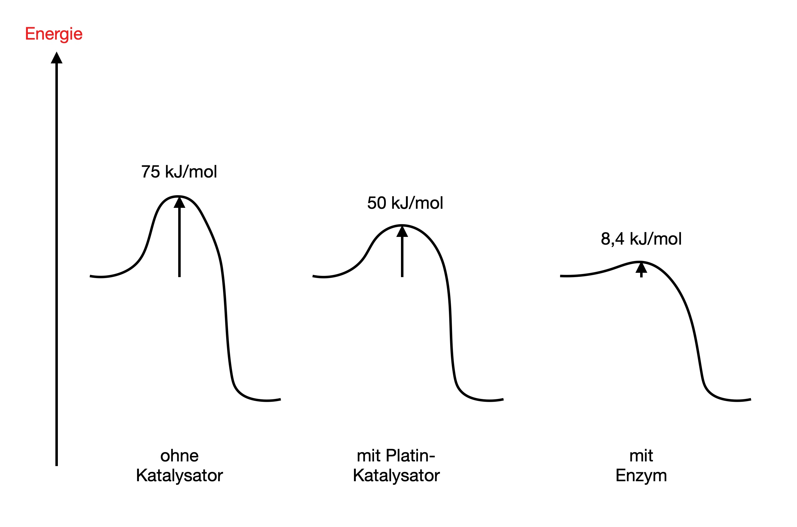 In einem alten Biochemie-Buch aus den 80er Jahren [2] habe ich folgende konkrete Daten für die Wirkung eines anorganischen Katalysators und eines Enzyms gefunden. Es ging um die Zersetzung von Wasserstoffperoxid H2O2 zu Wasser und Sauerstoff. Die Aktivierungsenergie der Reaktion liegt bei ca. 75 kJ/mol. Ein Platin-Katalysator senkt die Aktivierungsenergie auf rund 50 kJ/mol, während das Enzym Katalase die Aktivierungsenergie auf nur noch 8,4 kJ/mol senkt.