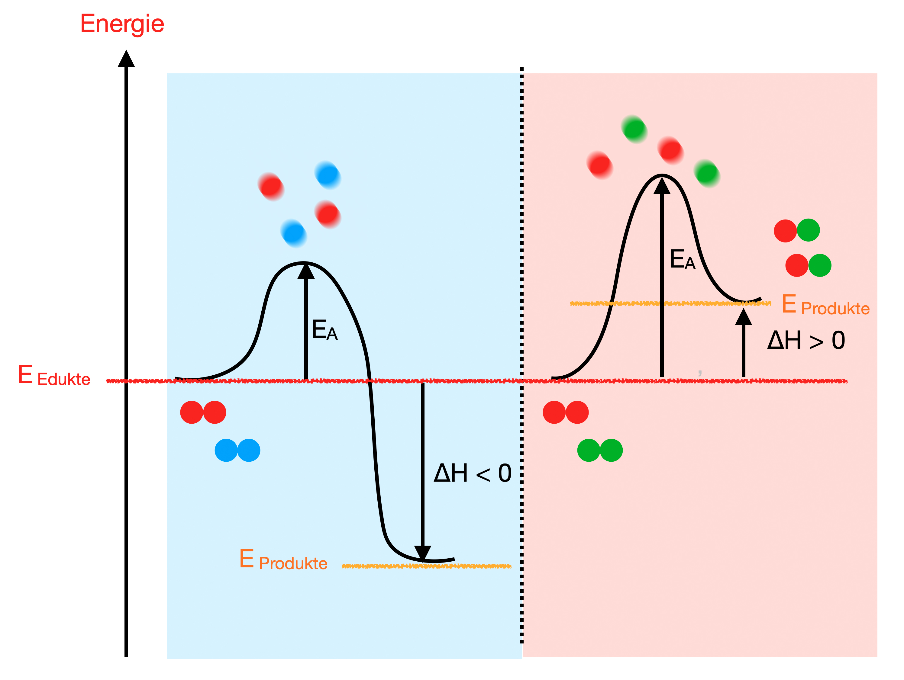 Hier sehen wir die Energiediagramme einer exothermen Reaktion (zum Beispiel Verbrennung von Magnesium) und einer endothermen Reaktion (zum Beispiel Elektrolyse von Wasser).