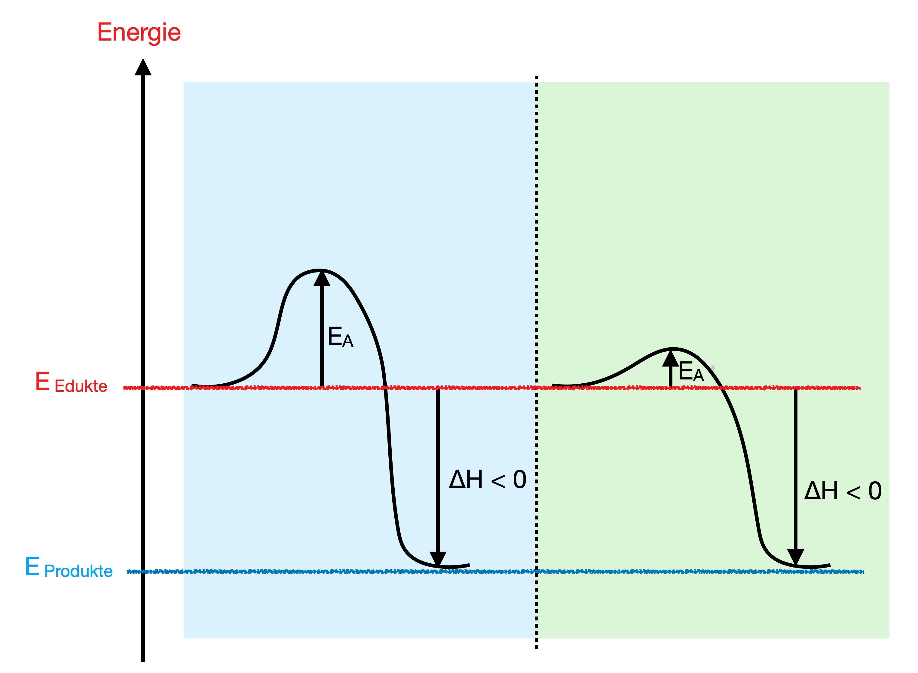 Das rechte Energiediagramm zeigt die gleiche Reaktion, aber mit Katalysator. Die Aktivierungsenergie ist jetzt wesentlich niedriger. Und genau das ist der Effekt eines Katalysators: Katalysatoren erniedrigen die Aktivierungsenergie einer chemischen Reaktion und erhöhen dadurch die Reaktionsgeschwindigkeit.