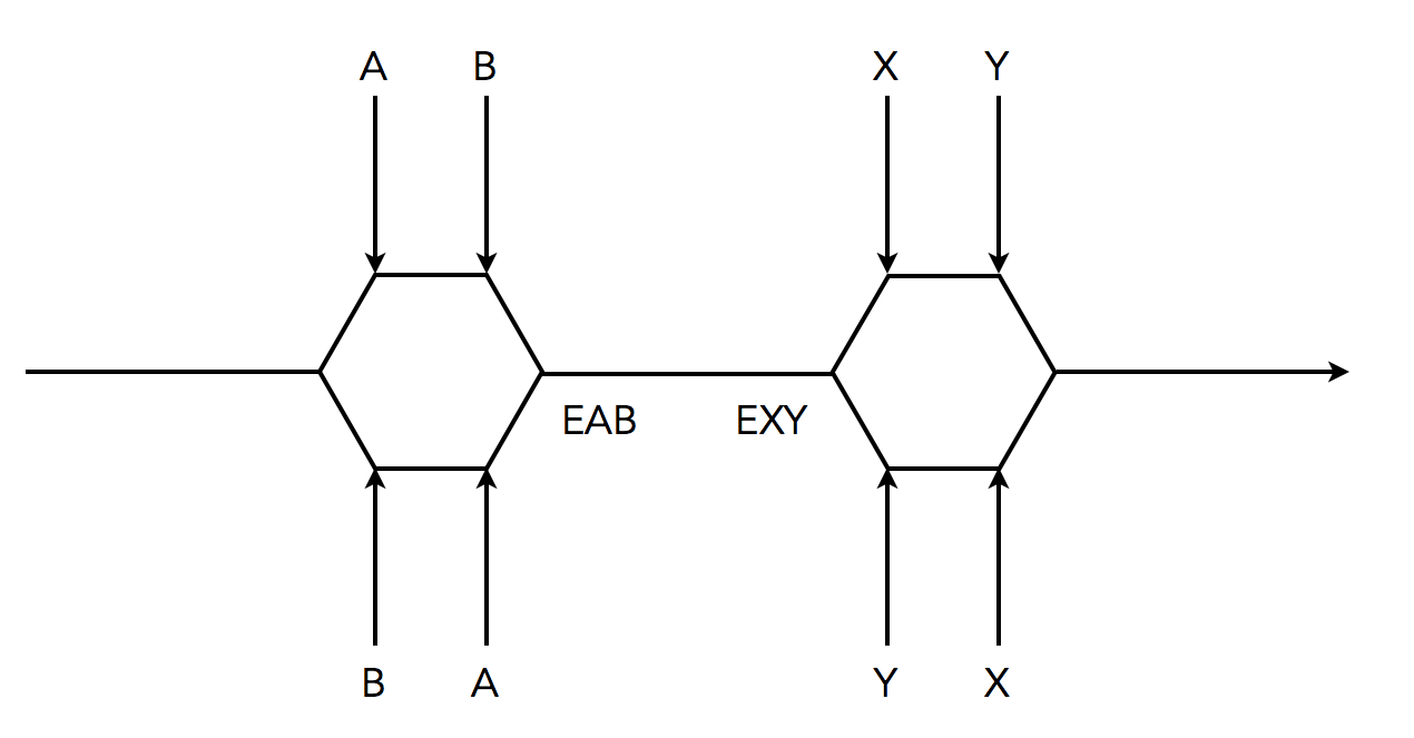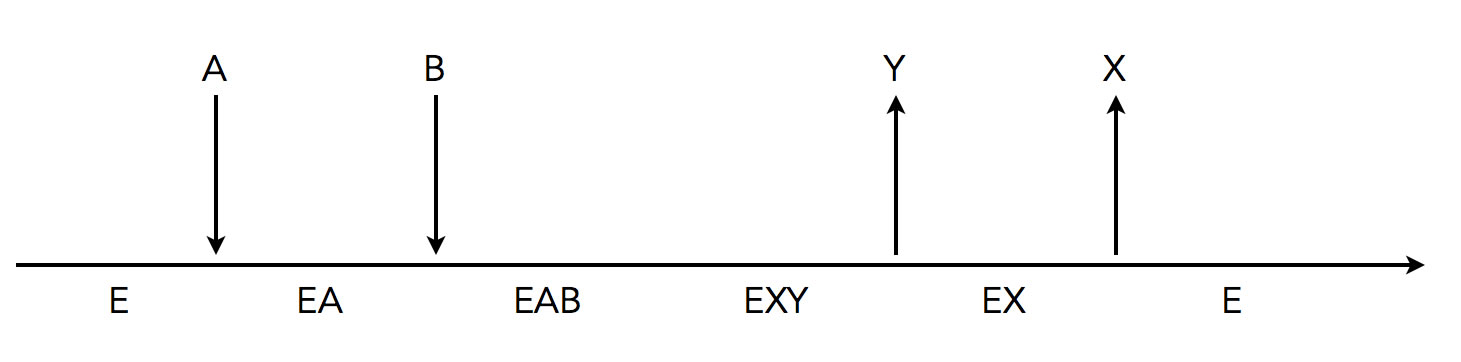 Bei der Freisetzung der beiden Produkte X und Y wiederholt sich jetzt das Spiel: Entweder wird zuerst X und dann Y freigesetzt oder umgekehrt.