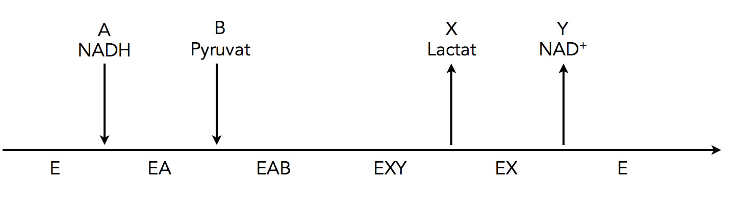 - Beide Substrate können in einer zufälligen Reihenfolge nacheinander an das Enzym binden.